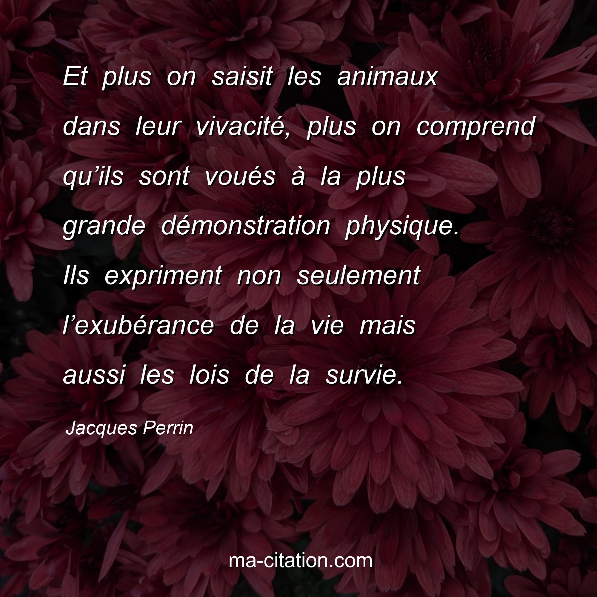 Citation sur la vie de Jacques Perrin :Et plus on saisit les animaux dans leur vivacité, plus on comprend qu’ils sont voués à la plus grande démonstration physique. Ils expriment non seulement l’exubérance de la vie mais aussi les lois de la survie.