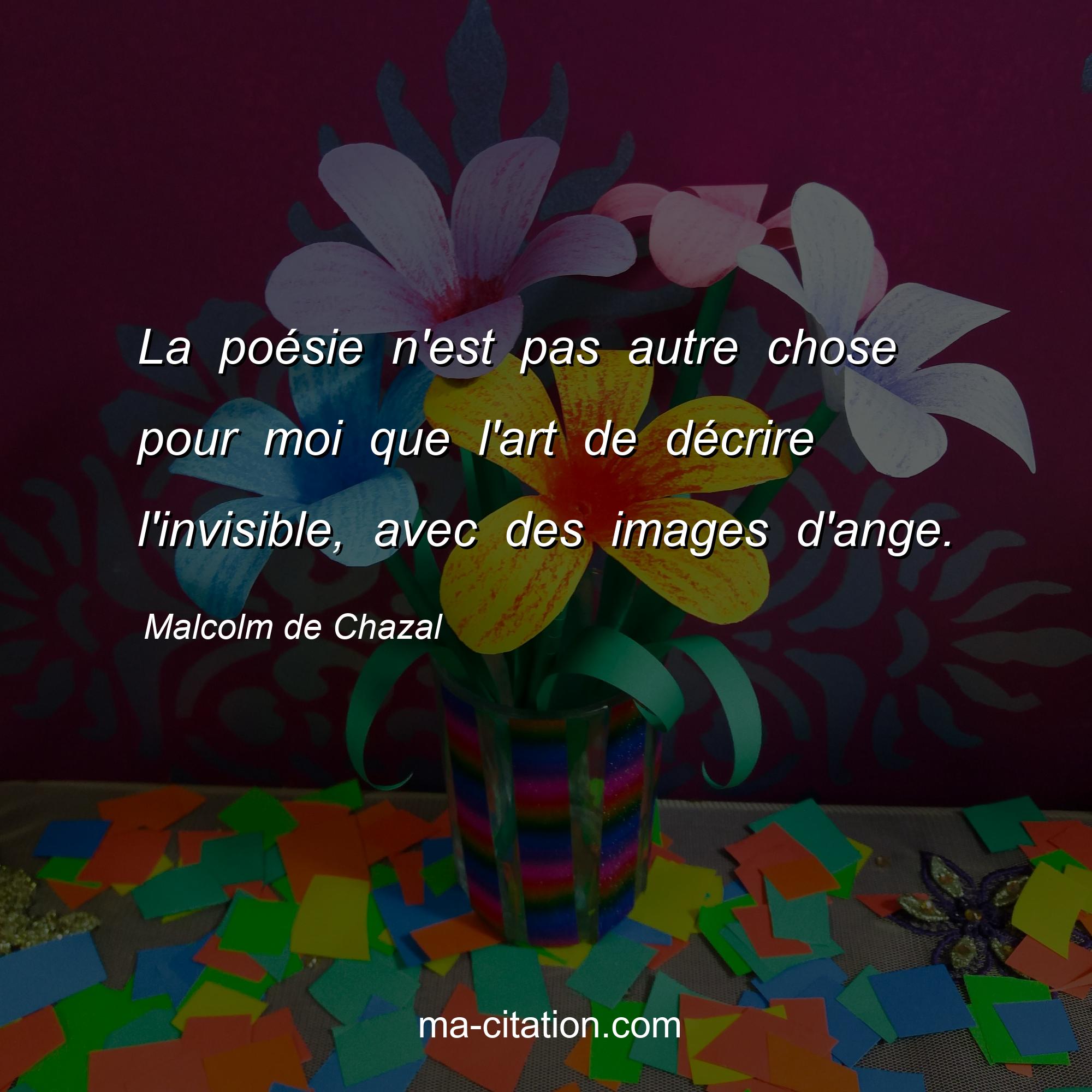 Citation sur la vie de Malcolm de Chazal :La poésie n'est pas autre chose pour moi que l'art de décrire l'invisible, avec des images d'ange.