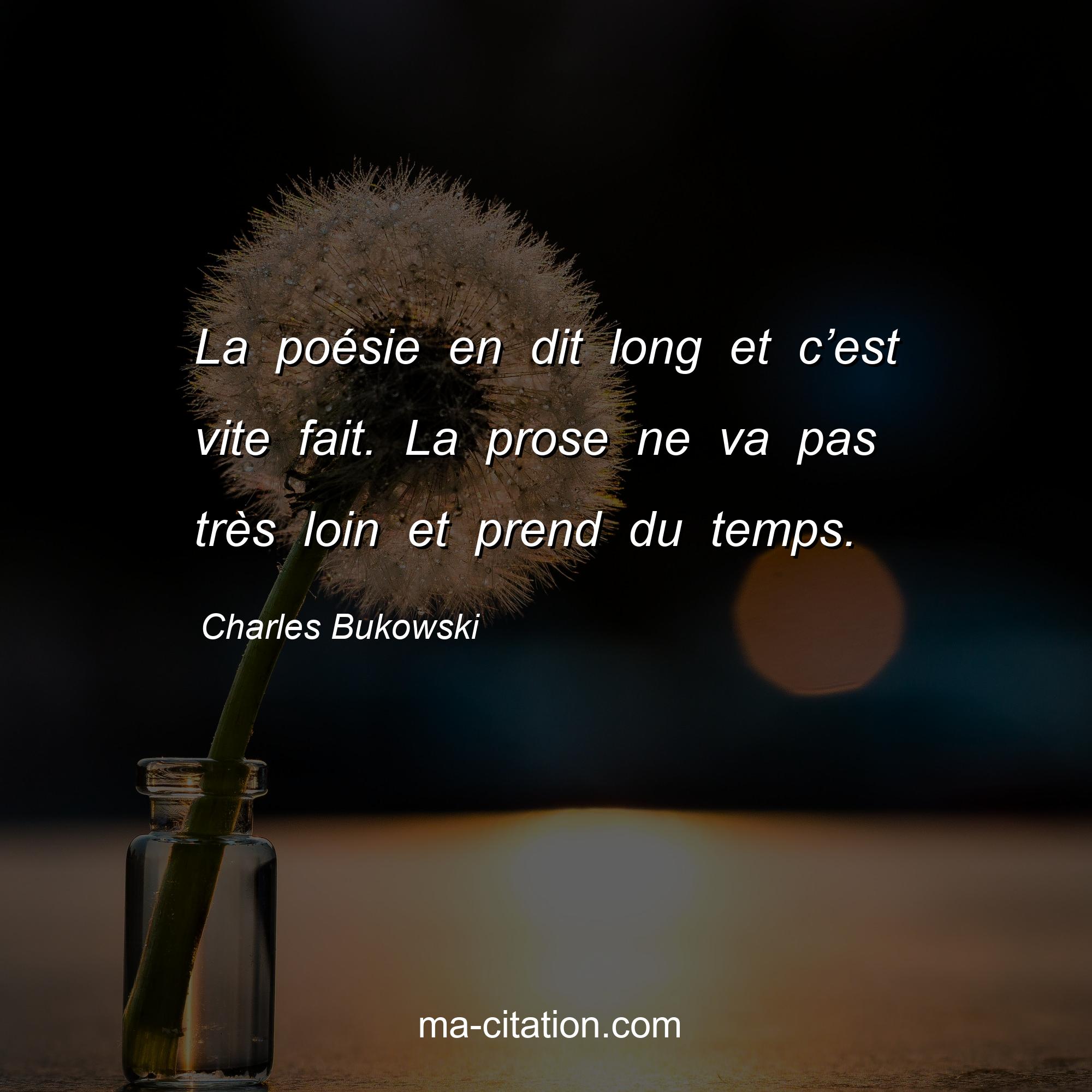Citation sur la vie de Charles Bukowski :La poésie en dit long et c’est vite fait. La prose ne va pas très loin et prend du temps.