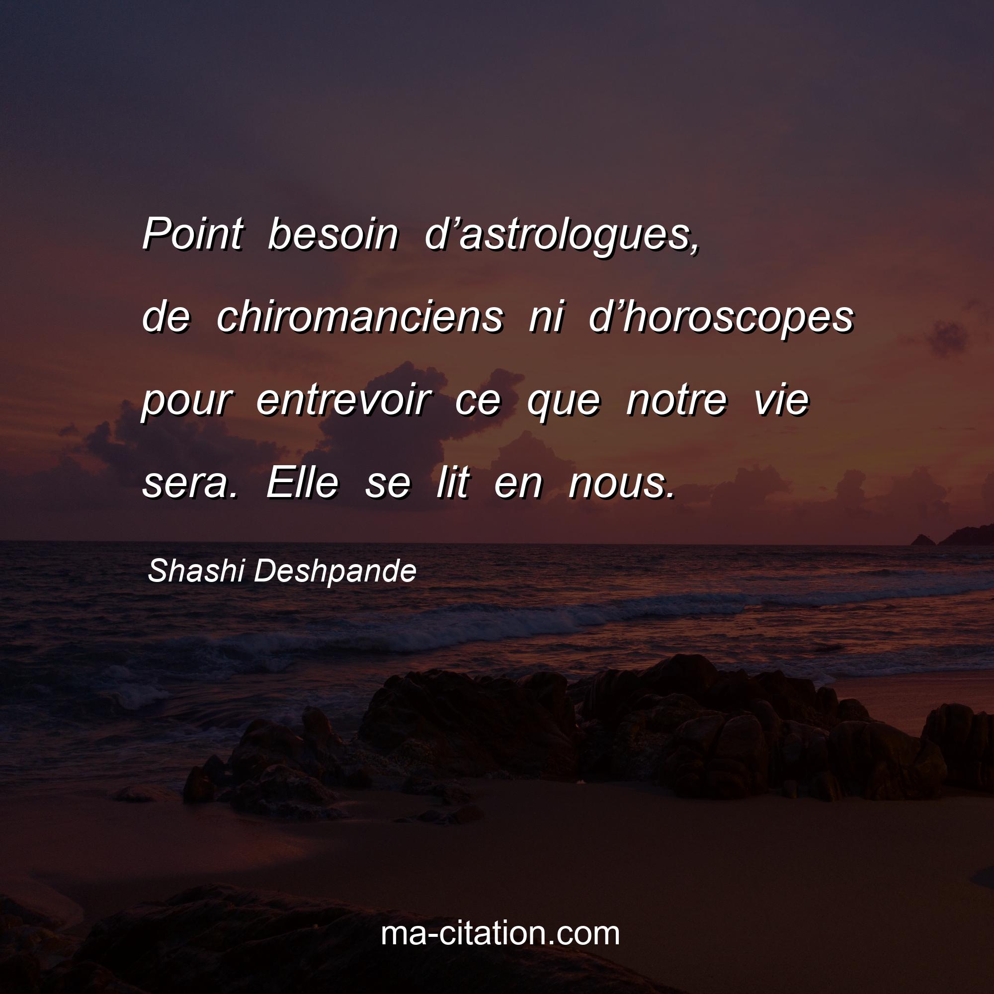 Shashi Deshpande est l'auteur de la citation sur la vie "Point besoin d’astrologues, de chiromanciens ni d’horoscopes pour entrevoir ce que notre vie sera. Elle se lit en nous.".
