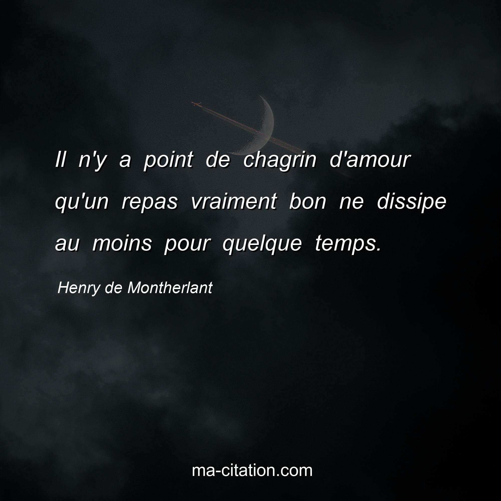 Citation sur la vie de Henry de Montherlant :Il n'y a point de chagrin d'amour qu'un repas vraiment bon ne dissipe au moins pour quelque temps.