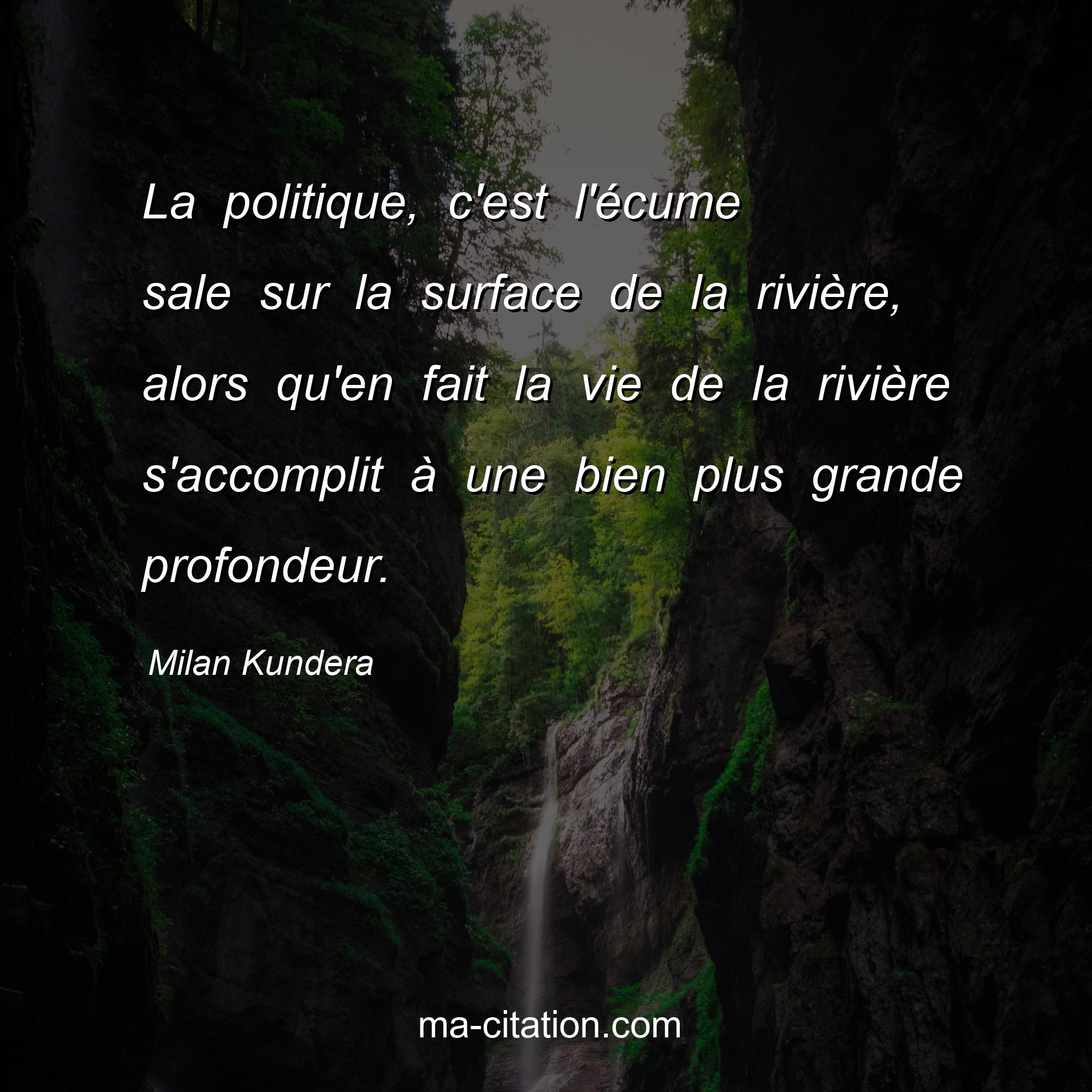 Citation sur la vie de Milan Kundera :La politique, c'est l'écume sale sur la surface de la rivière, alors qu'en fait la vie de la rivière s'accomplit à une bien plus grande profondeur.