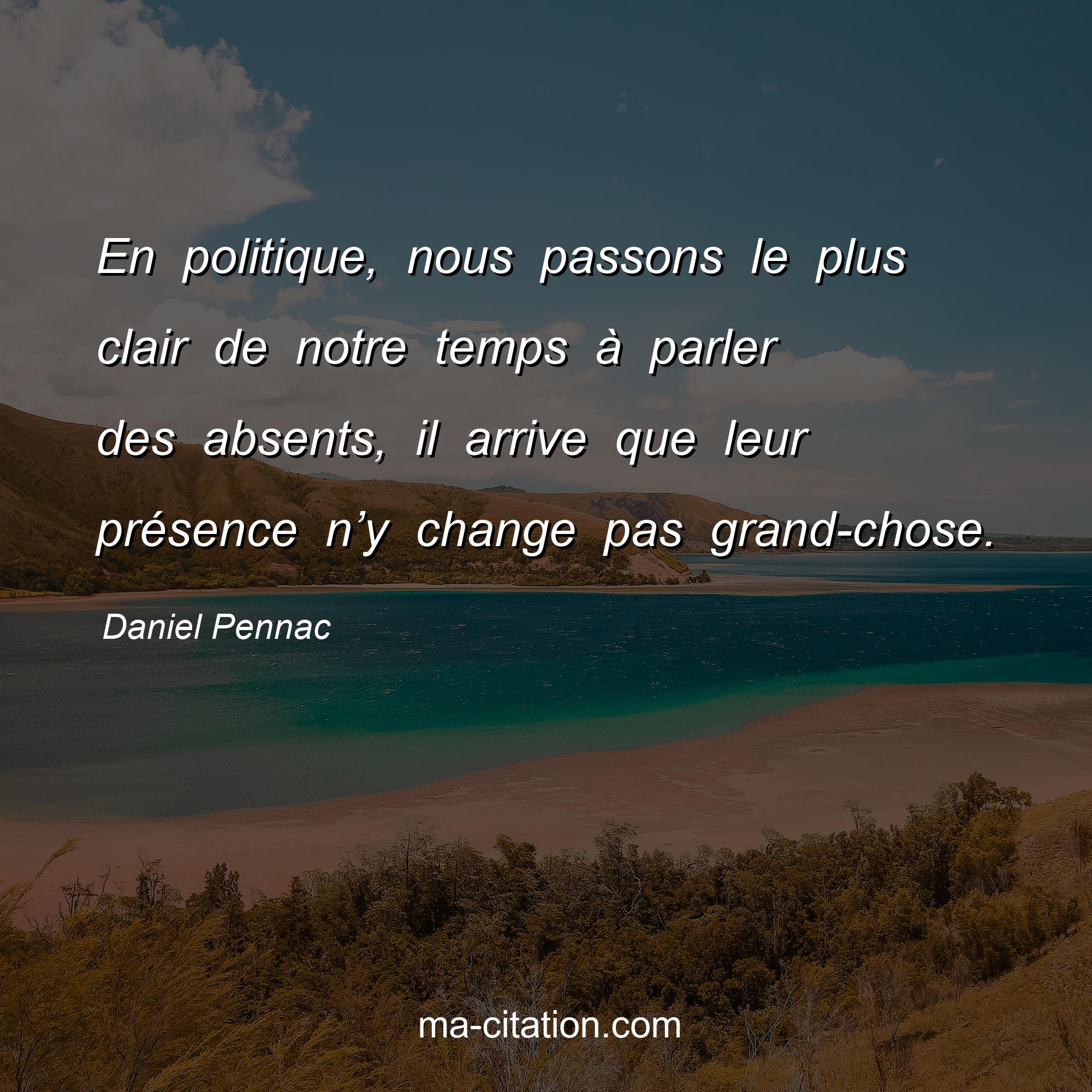 Citation sur la vie de Daniel Pennac :En politique, nous passons le plus clair de notre temps à parler des absents, il arrive que leur présence n’y change pas grand-chose.