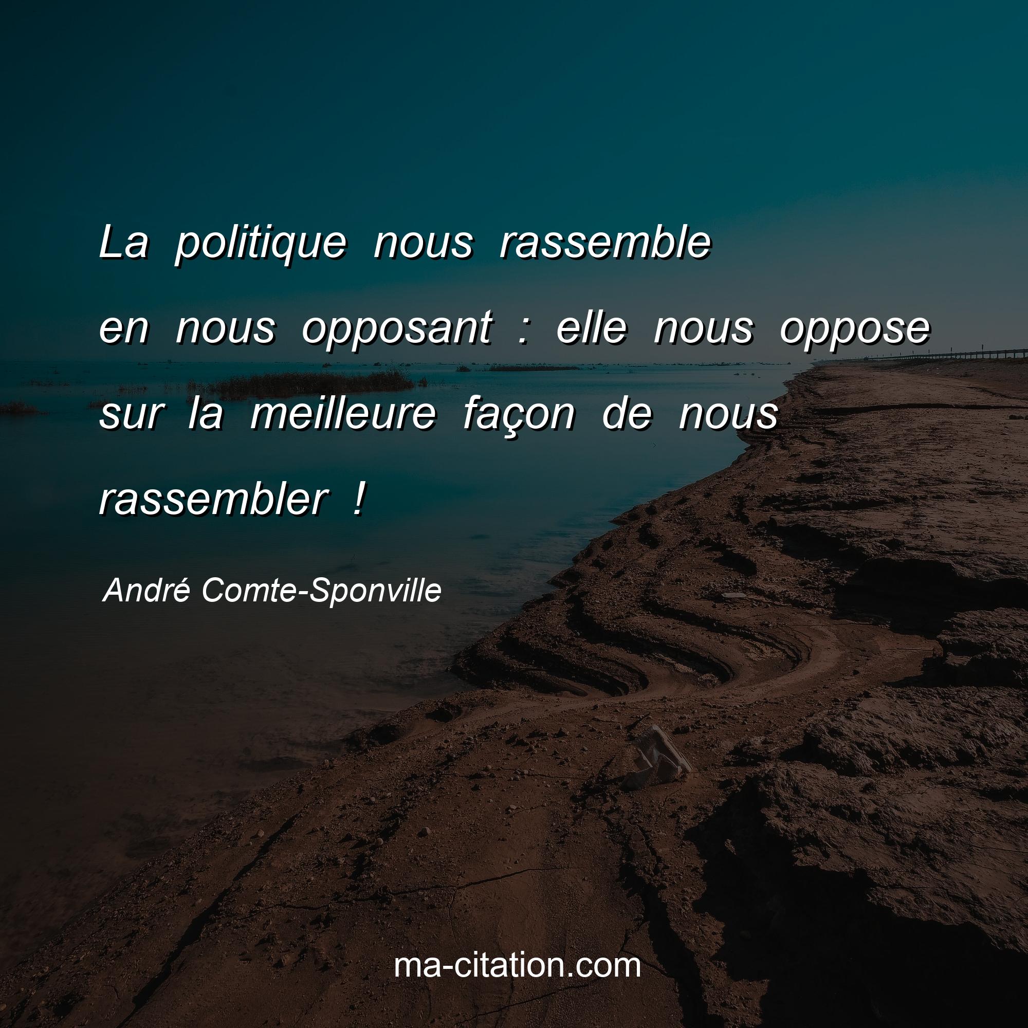 Citation sur la vie d'André Comte-Sponville :La politique nous rassemble en nous opposant : elle nous oppose sur la meilleure façon de nous rassembler !