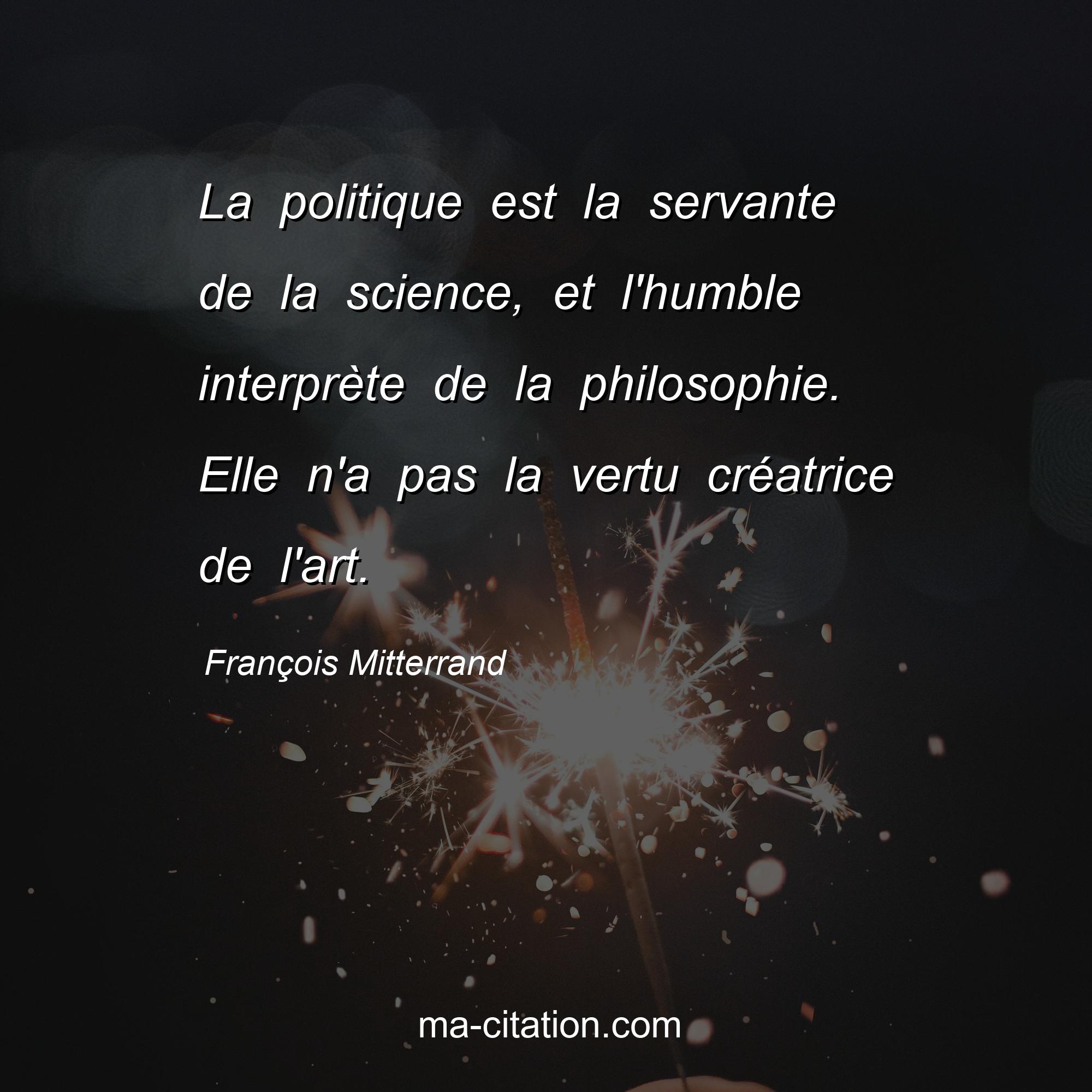 Citation sur la vie de François Mitterrand :La politique est la servante de la science, et l'humble interprète de la philosophie. Elle n'a pas la vertu créatrice de l'art.