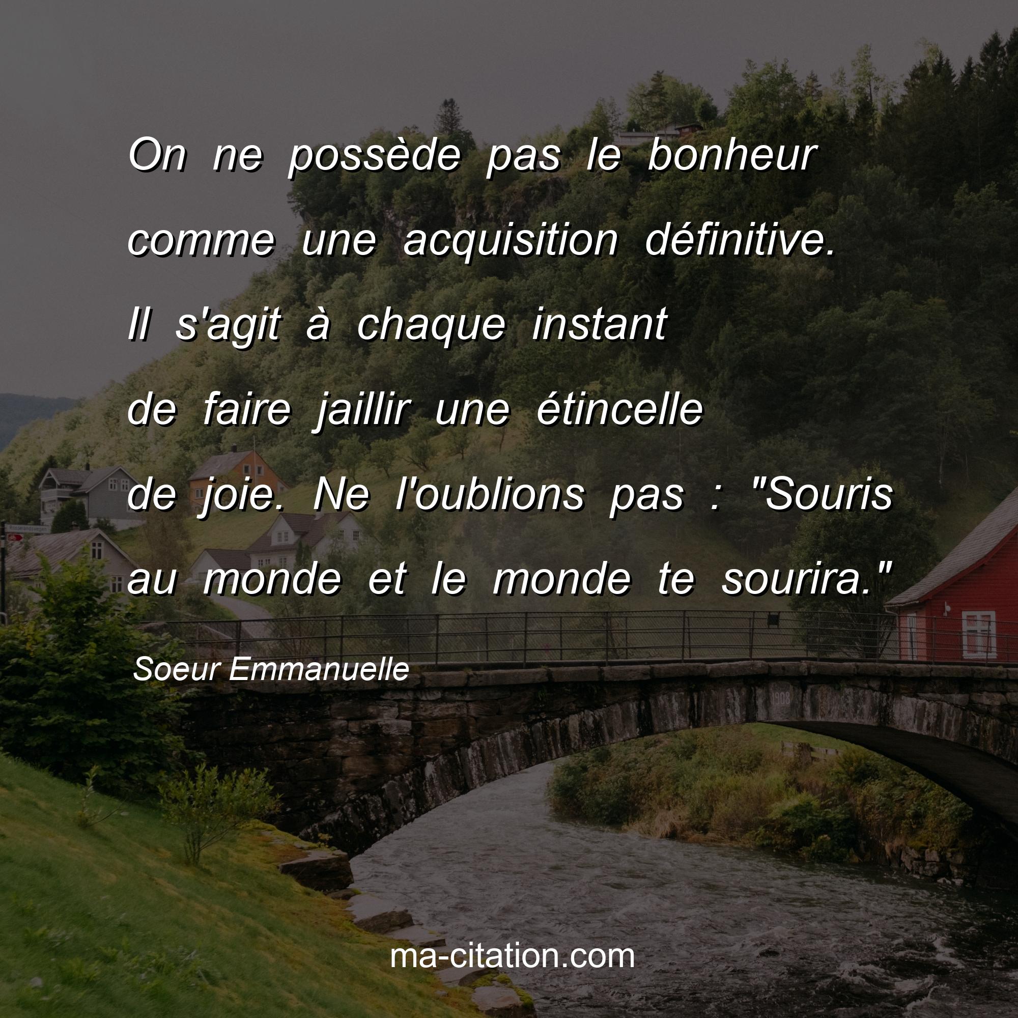 Citation sur la vie de Soeur Emmanuelle :On ne possède pas le bonheur comme une acquisition définitive. Il s'agit à chaque instant de faire jaillir une étincelle de joie. Ne l'oublions pas : "Souris au monde et le monde te sourira."