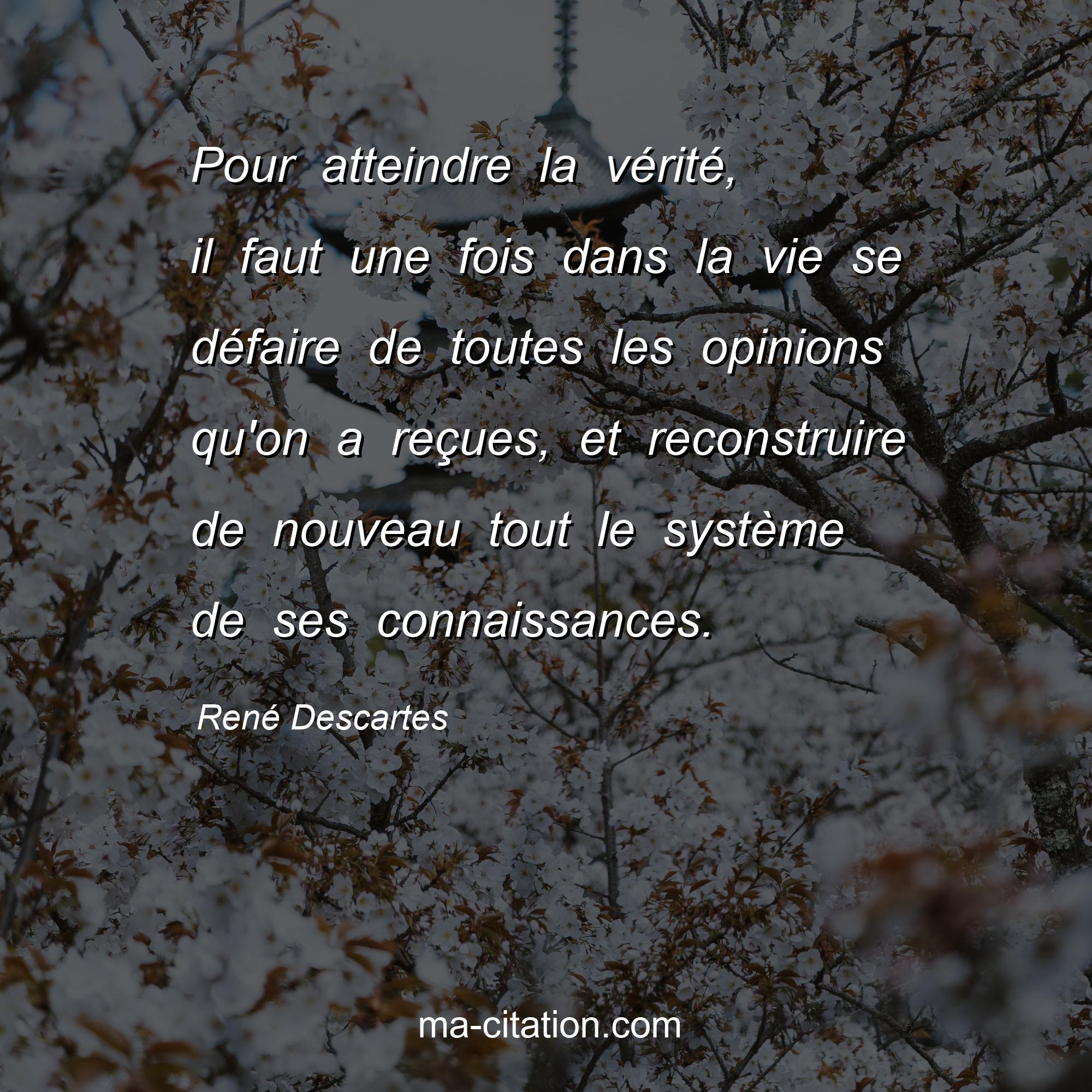Citation sur la vie de René Descartes :Pour atteindre la vérité, il faut une fois dans la vie se défaire de toutes les opinions qu'on a reçues, et reconstruire de nouveau tout le système de ses connaissances.