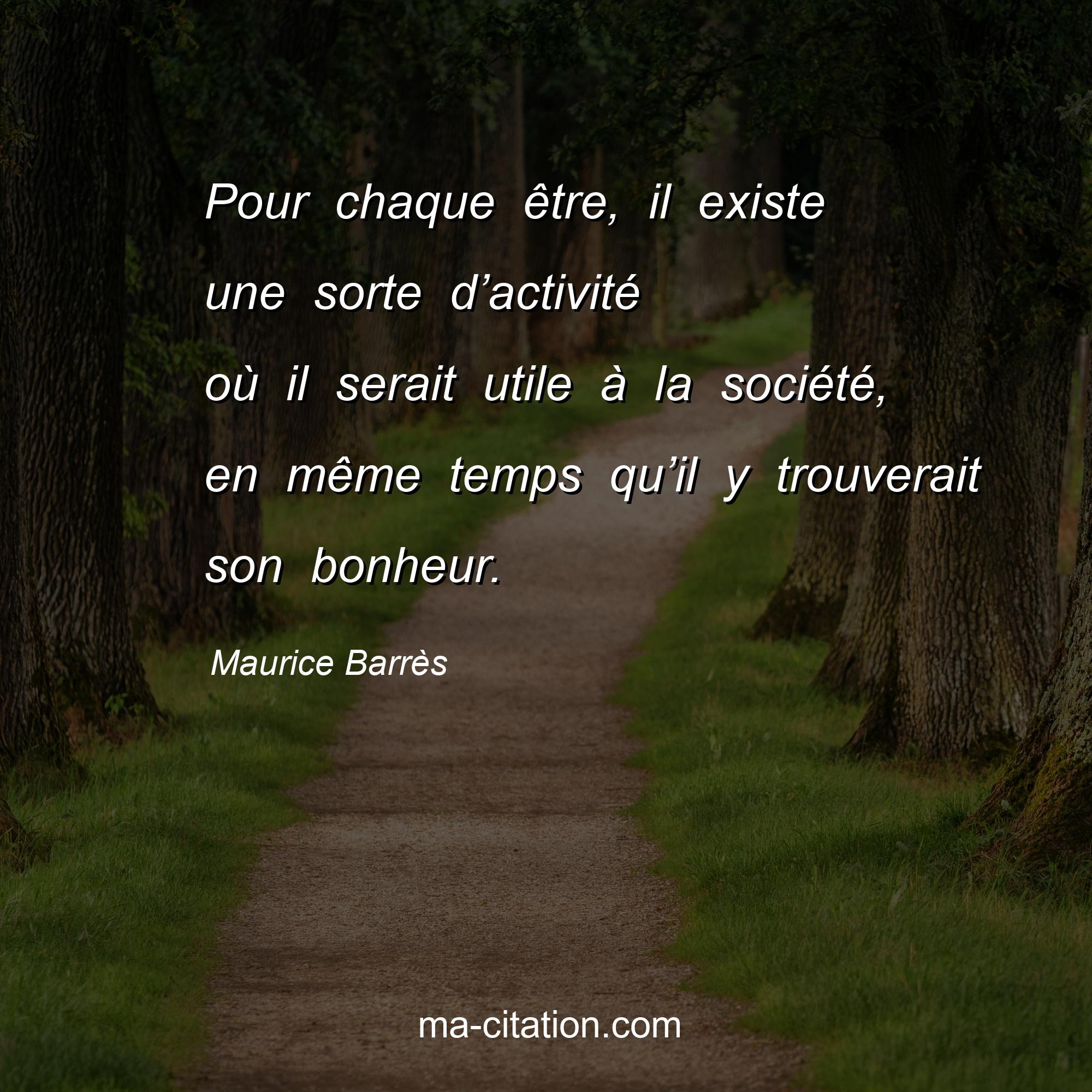 Citation sur la vie de Maurice Barrès :Pour chaque être, il existe une sorte d’activité où il serait utile à la société, en même temps qu’il y trouverait son bonheur.