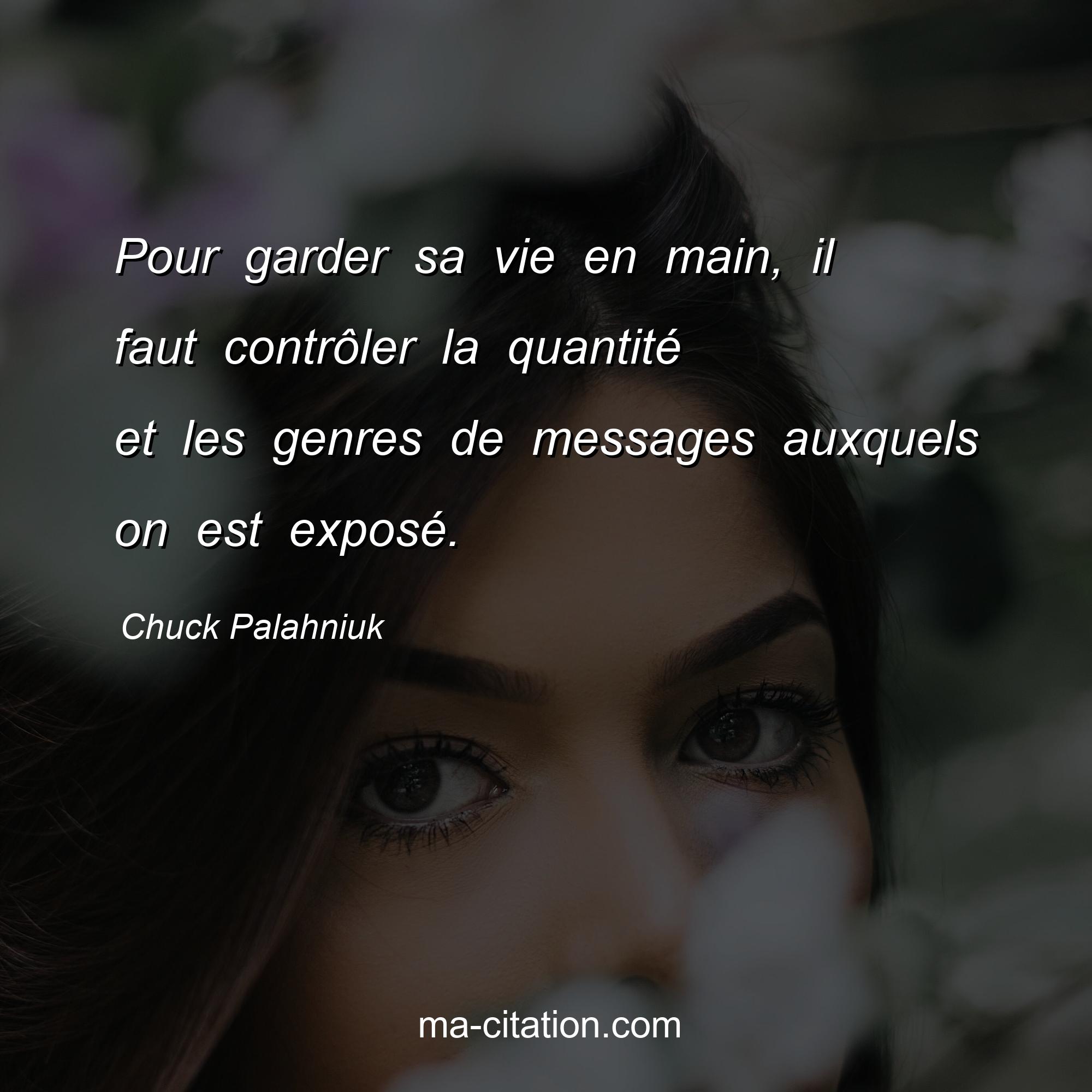 Citation sur la vie de Chuck Palahniuk :Pour garder sa vie en main, il faut contrôler la quantité et les genres de messages auxquels on est exposé.