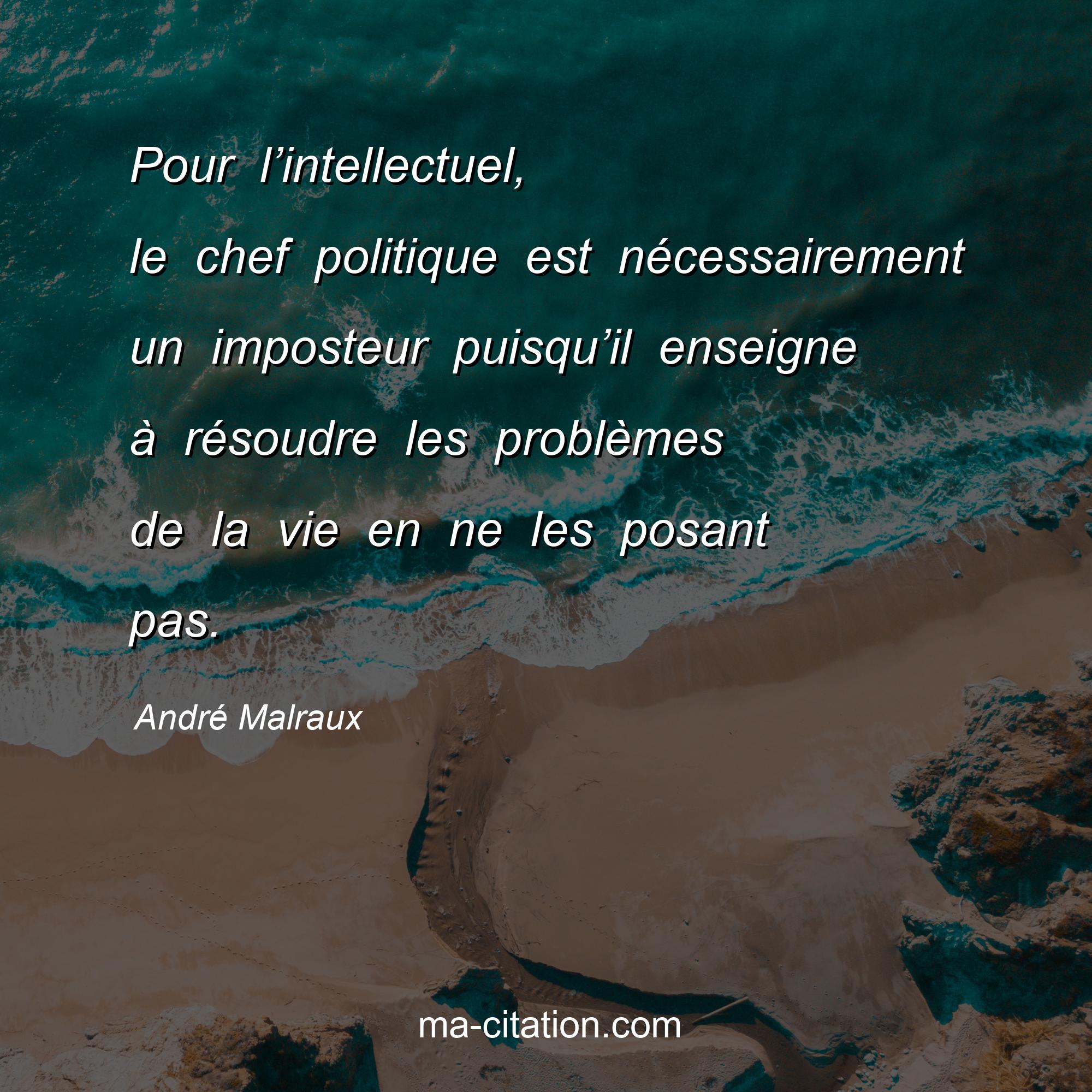 Citation sur la vie d'André Malraux :Pour l’intellectuel, le chef politique est nécessairement un imposteur puisqu’il enseigne à résoudre les problèmes de la vie en ne les posant pas.