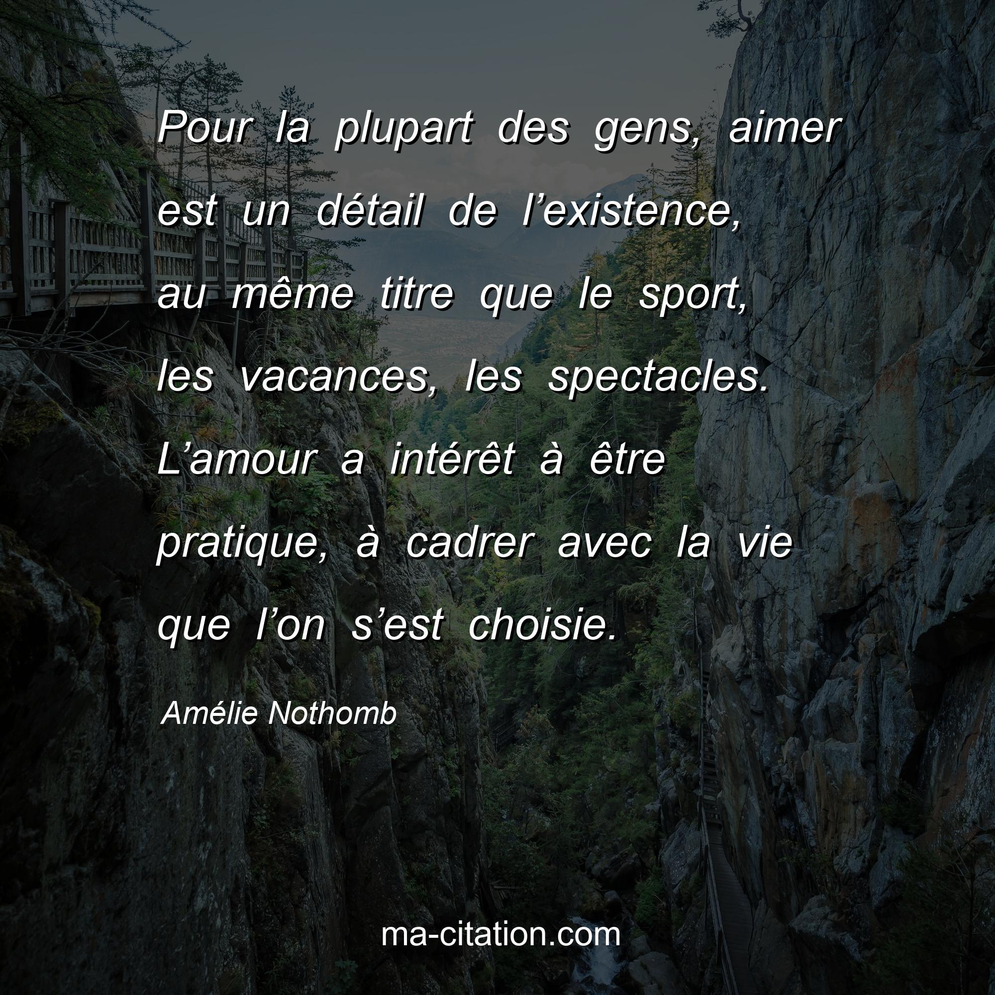 Citation sur la vie d'Amélie Nothomb :Pour la plupart des gens, aimer est un détail de l’existence, au même titre que le sport, les vacances, les spectacles. L’amour a intérêt à être pratique, à cadrer avec la vie que l’on s’est choisie.
