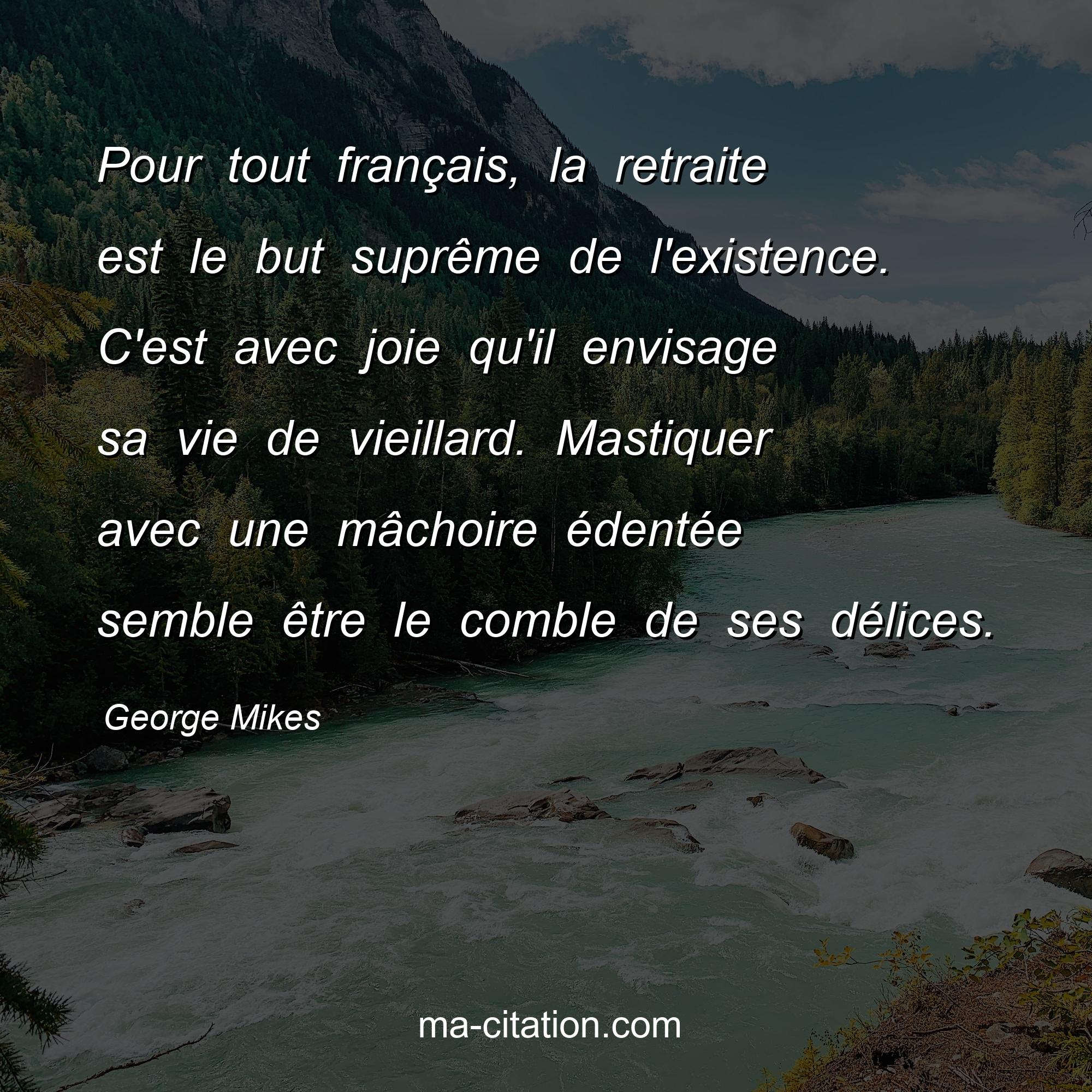 Citation sur la vie de George Mikes :Pour tout français, la retraite est le but suprême de l'existence. C'est avec joie qu'il envisage sa vie de vieillard. Mastiquer avec une mâchoire édentée semble être le comble de ses délices.