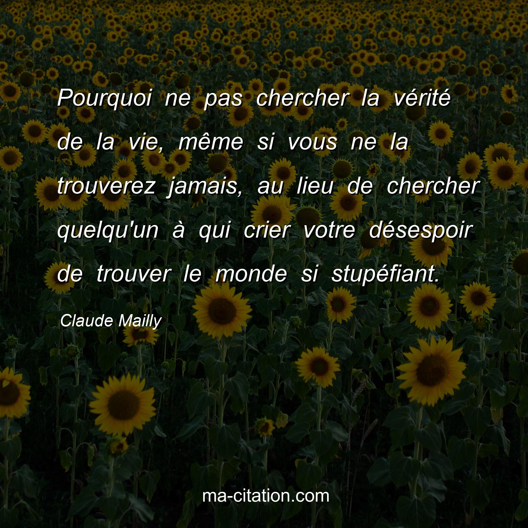 Claude Mailly est l'auteur de la citation sur la vie "Pourquoi ne pas chercher la vérité de la vie, même si vous ne la trouverez jamais, au lieu de chercher quelqu'un à qui crier votre désespoir de trouver le monde si stupéfiant.".