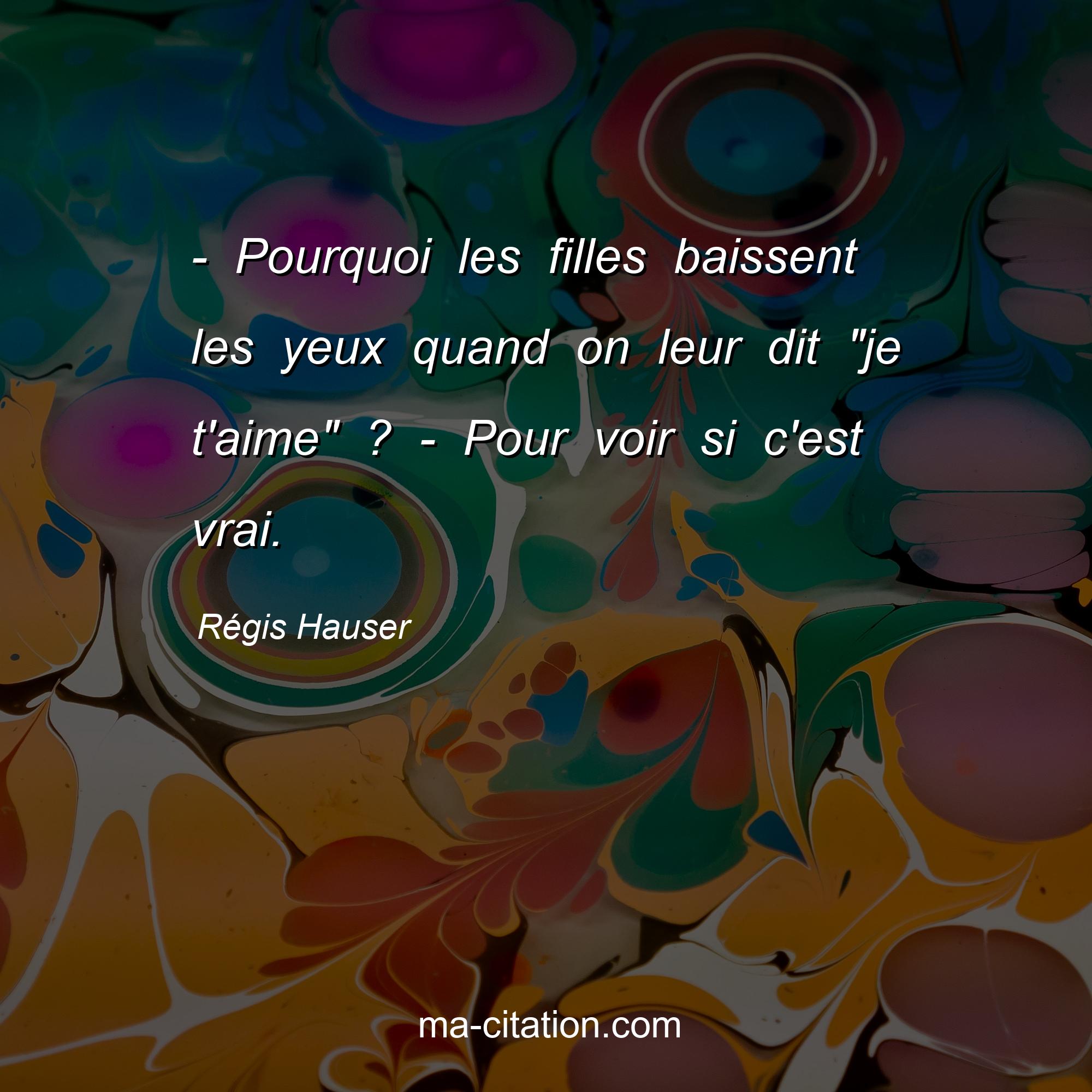 Citation sur la vie de Régis Hauser :- Pourquoi les filles baissent les yeux quand on leur dit "je t'aime" ? - Pour voir si c'est vrai.