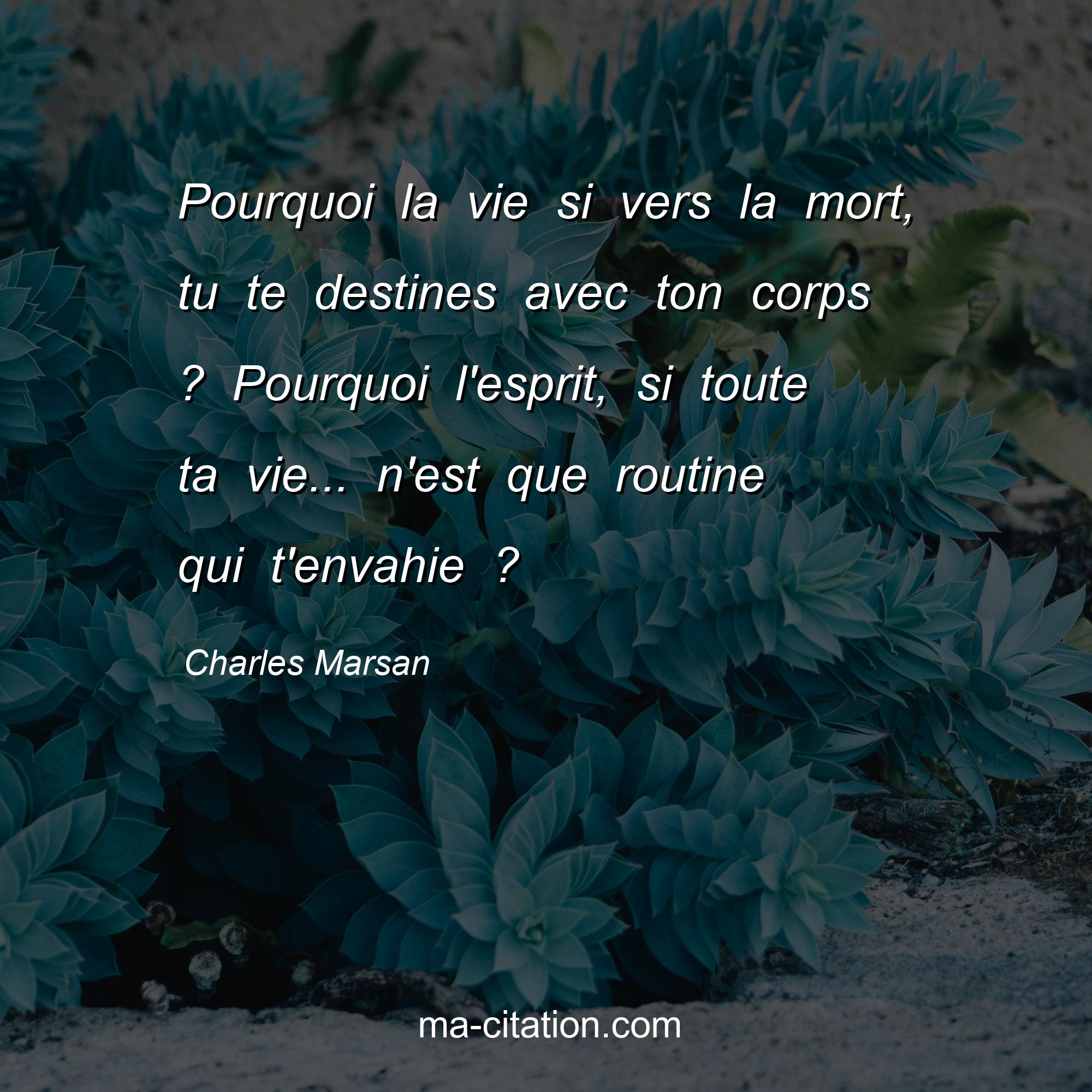 Charles Marsan est l'auteur de la citation sur la vie "Pourquoi la vie si vers la mort, tu te destines avec ton corps ? Pourquoi l'esprit, si toute ta vie... n'est que routine qui t'envahie ?".