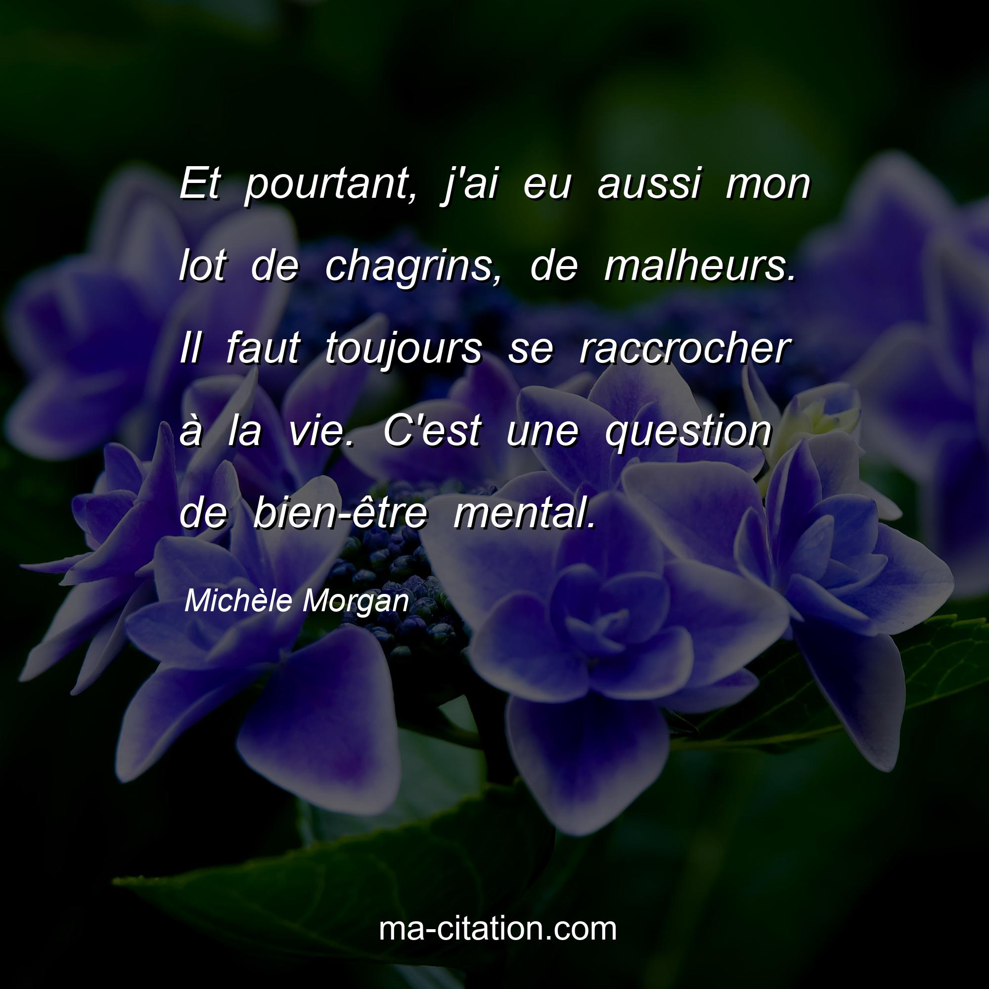 Citation sur la vie de Michèle Morgan :Et pourtant, j'ai eu aussi mon lot de chagrins, de malheurs. Il faut toujours se raccrocher à la vie. C'est une question de bien-être mental.