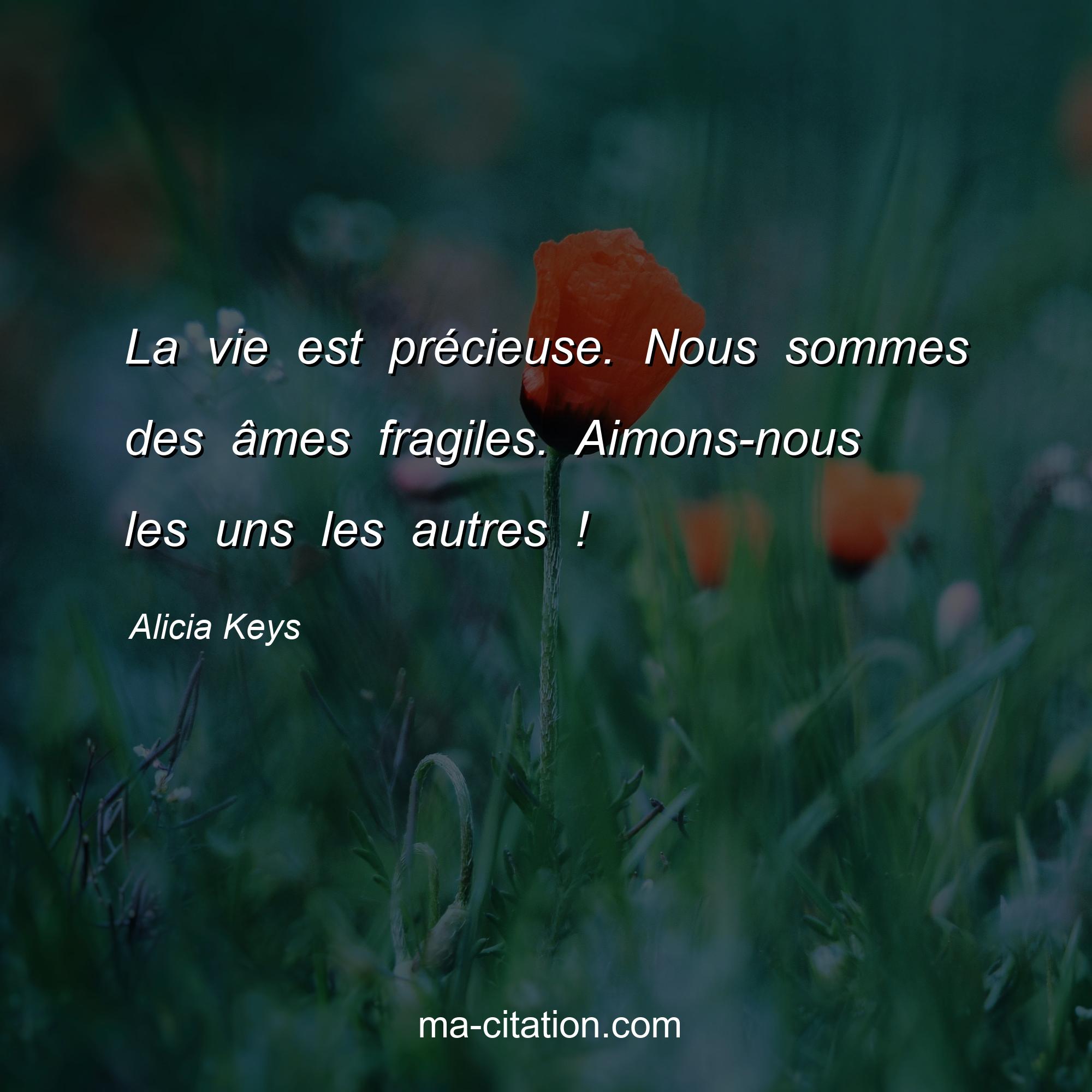 Citation sur la vie d'Alicia Keys :La vie est précieuse. Nous sommes des âmes fragiles. Aimons-nous les uns les autres !