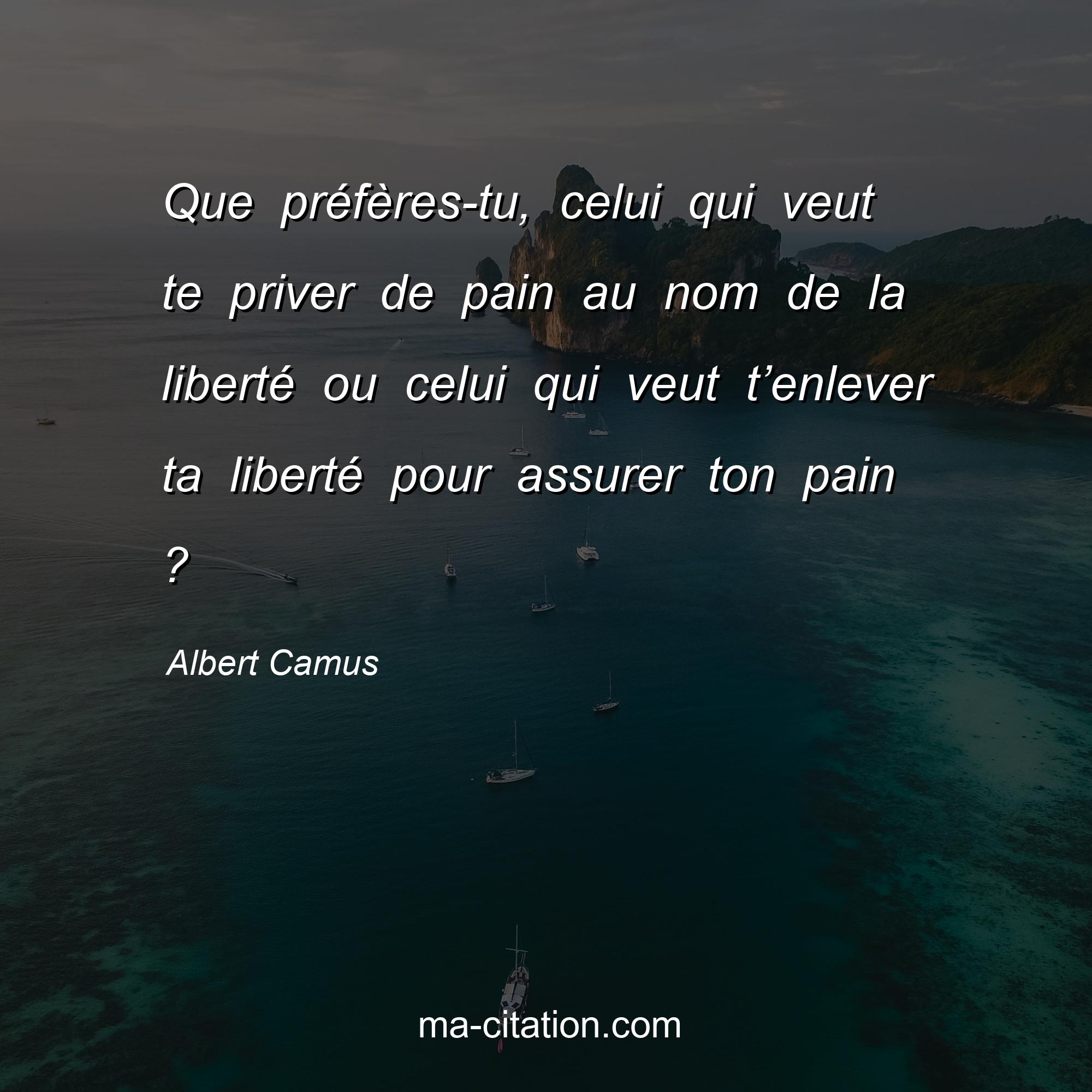 Citation sur la vie d'Albert Camus :Que préfères-tu, celui qui veut te priver de pain au nom de la liberté ou celui qui veut t’enlever ta liberté pour assurer ton pain ?