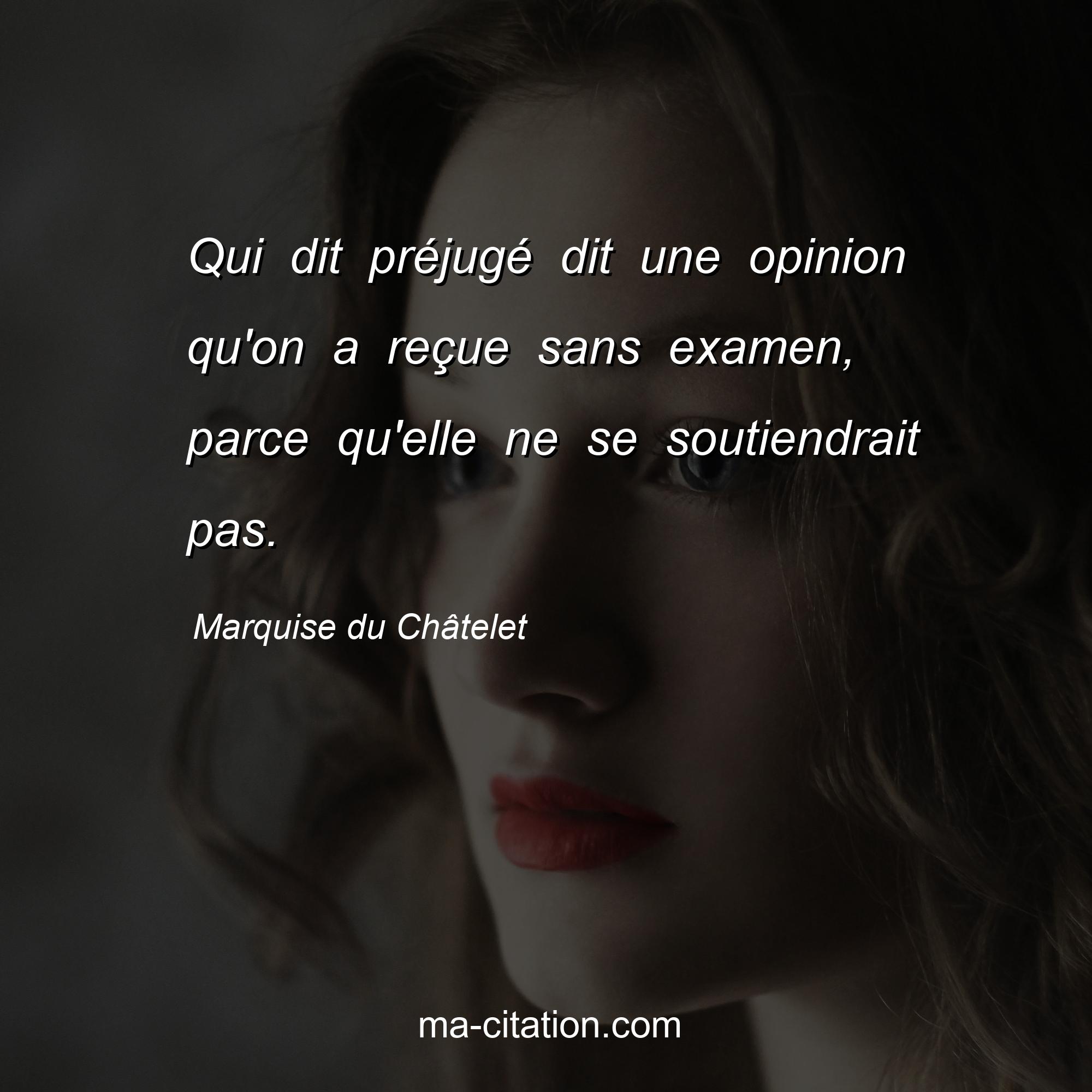 Citation sur la vie de Marquise du Châtelet :Qui dit préjugé dit une opinion qu'on a reçue sans examen, parce qu'elle ne se soutiendrait pas.