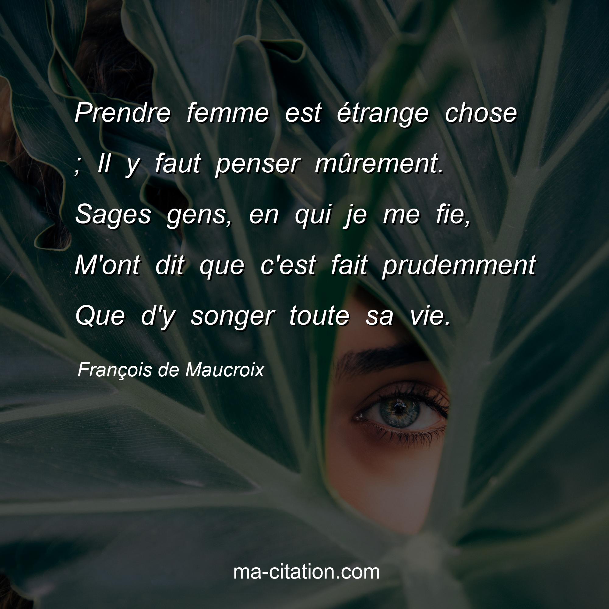 Citation sur la vie de François de Maucroix :Prendre femme est étrange chose ; Il y faut penser mûrement. Sages gens, en qui je me fie, M'ont dit que c'est fait prudemment Que d'y songer toute sa vie.