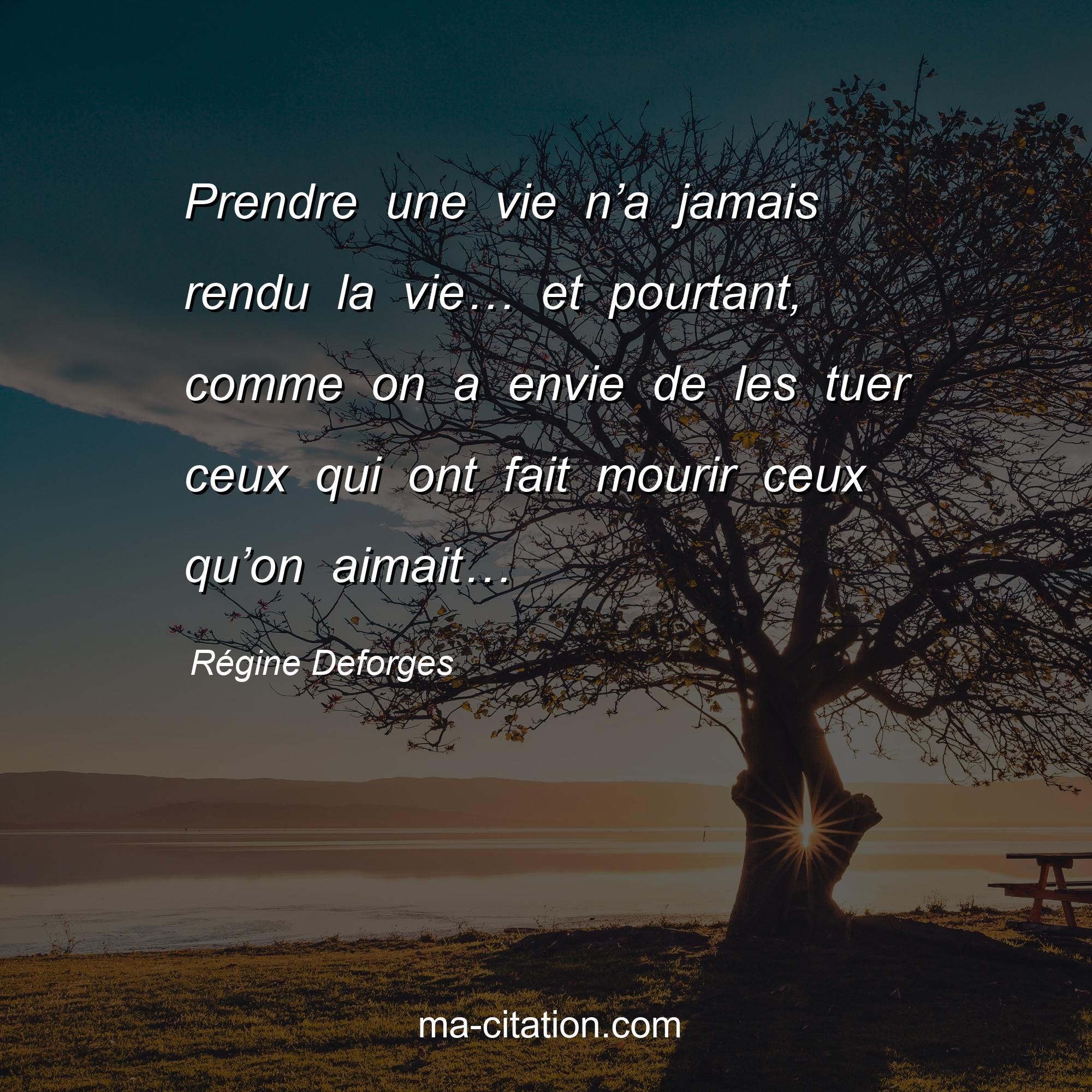 Régine Deforges est l'auteur de la citation sur la vie "Prendre une vie n’a jamais rendu la vie… et pourtant, comme on a envie de les tuer ceux qui ont fait mourir ceux qu’on aimait…".