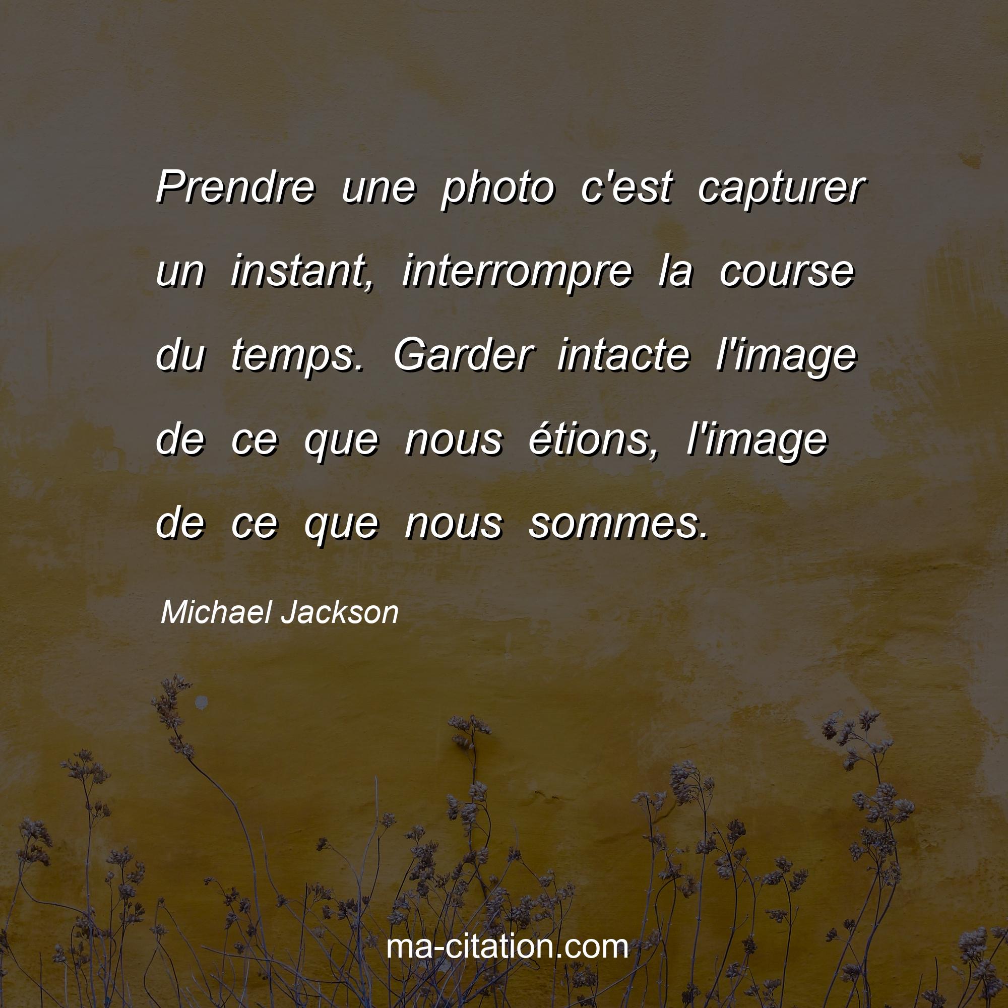 Citation sur la vie de Michael Jackson :Prendre une photo c'est capturer un instant, interrompre la course du temps. Garder intacte l'image de ce que nous étions, l'image de ce que nous sommes.