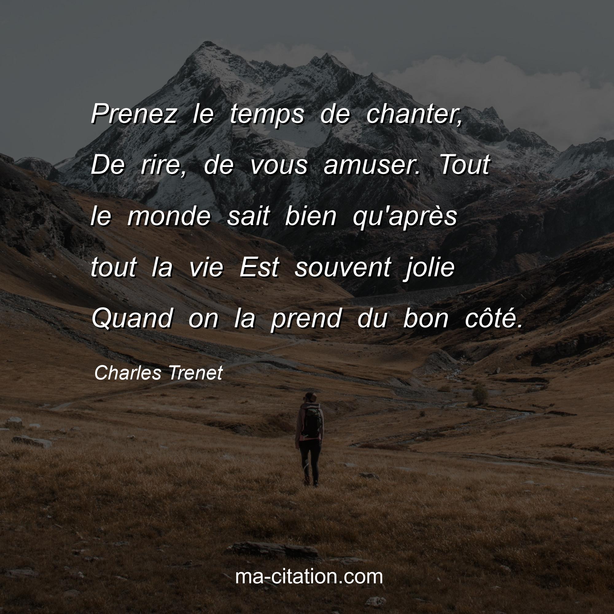 Citation sur la vie de Charles Trenet :Prenez le temps de chanter, De rire, de vous amuser. Tout le monde sait bien qu'après tout la vie Est souvent jolie Quand on la prend du bon côté.