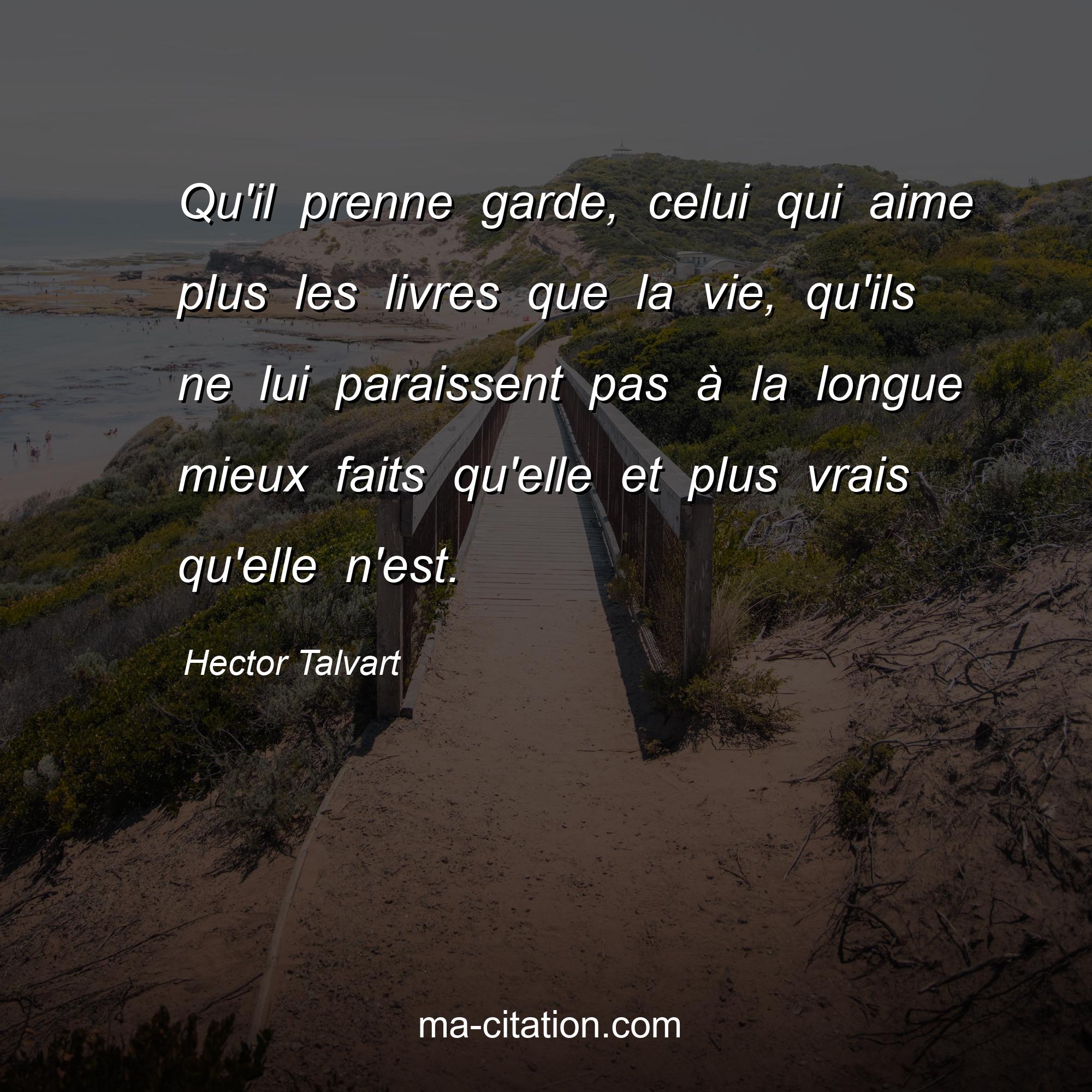 Citation sur la vie de Hector Talvart :Qu'il prenne garde, celui qui aime plus les livres que la vie, qu'ils ne lui paraissent pas à la longue mieux faits qu'elle et plus vrais qu'elle n'est.