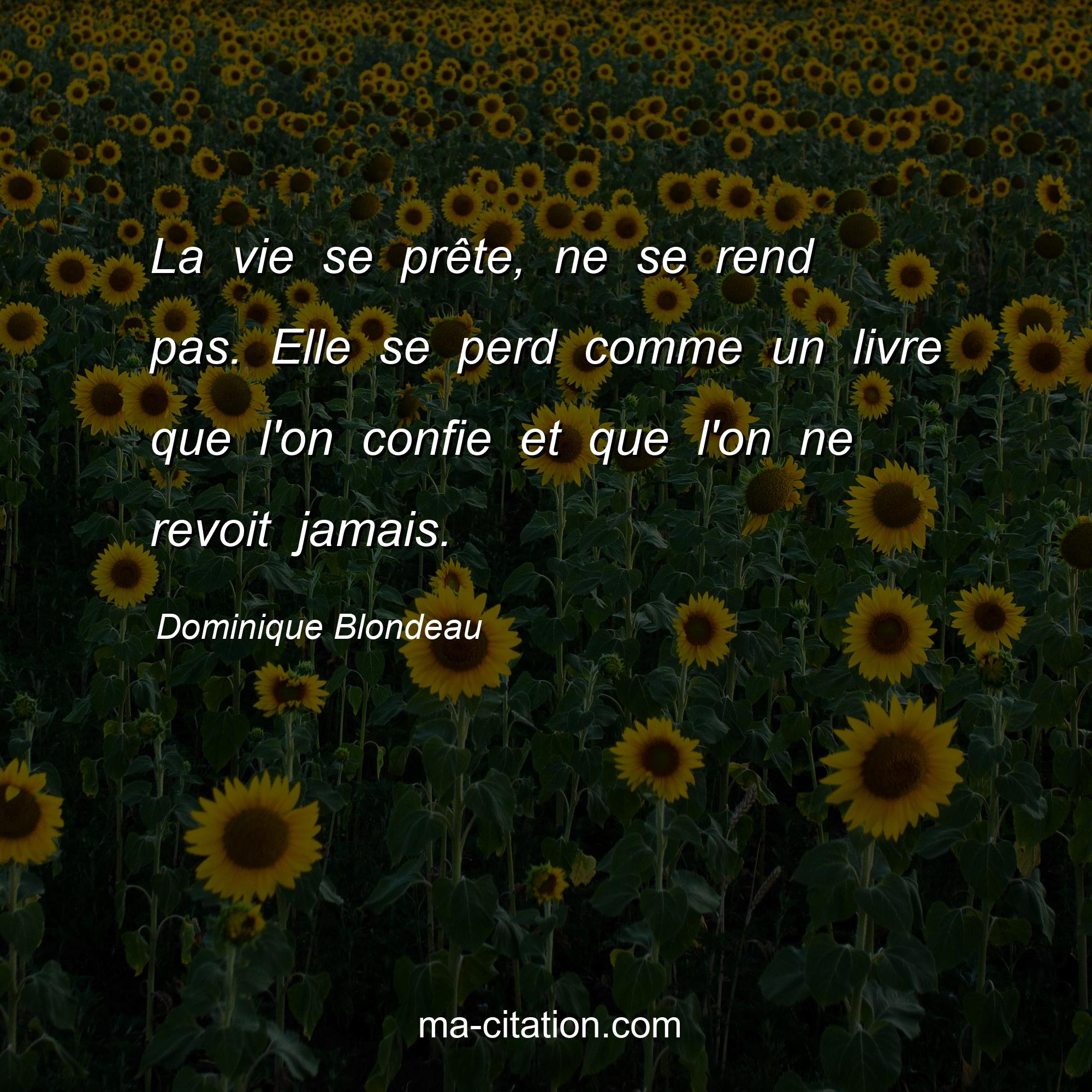 Dominique Blondeau est l'auteur de la citation sur la vie "La vie se prête, ne se rend pas. Elle se perd comme un livre que l'on confie et que l'on ne revoit jamais.".