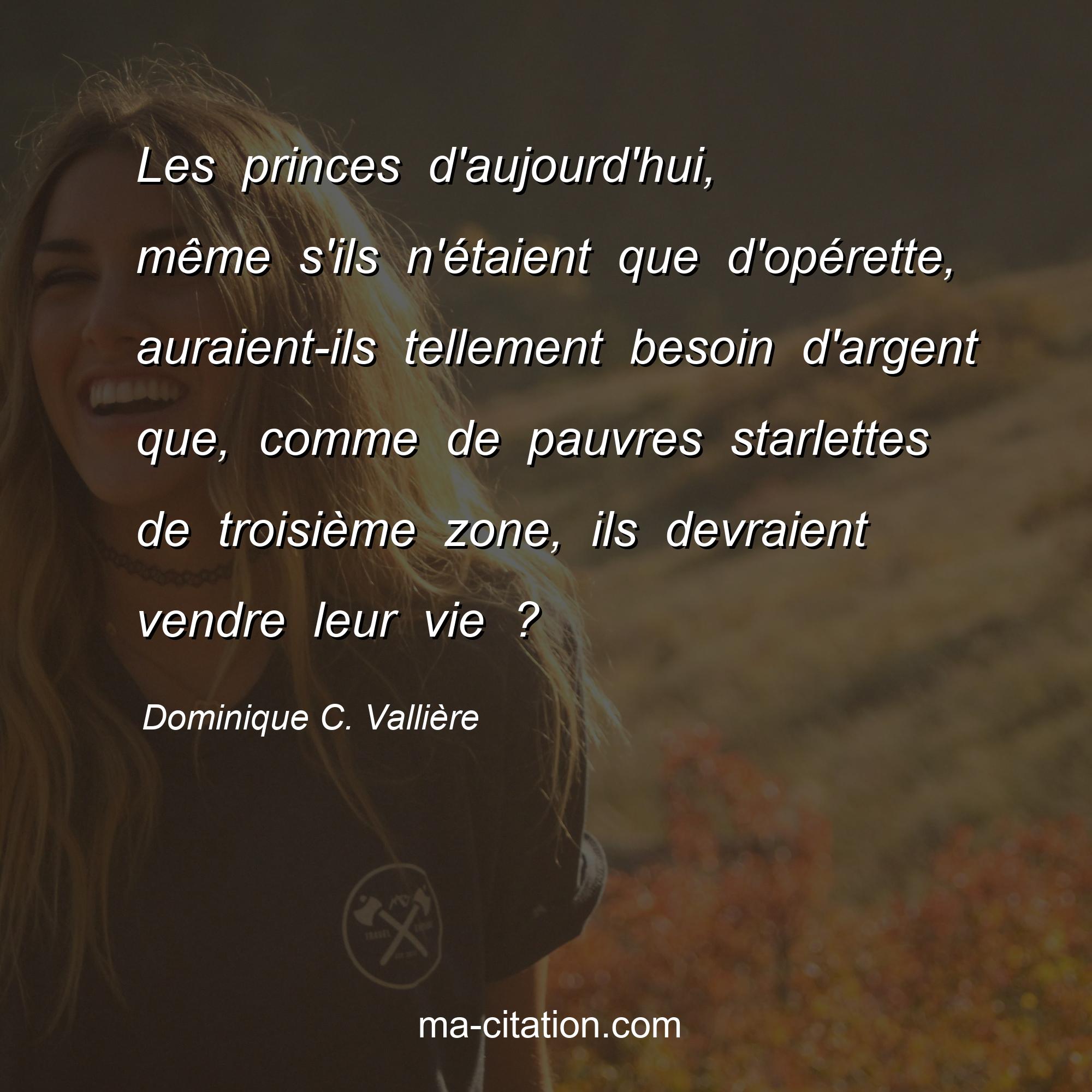 Dominique C. Vallière est l'auteur de la citation sur la vie "Les princes d'aujourd'hui, même s'ils n'étaient que d'opérette, auraient-ils tellement besoin d'argent que, comme de pauvres starlettes de troisième zone, ils devraient vendre leur vie ?".