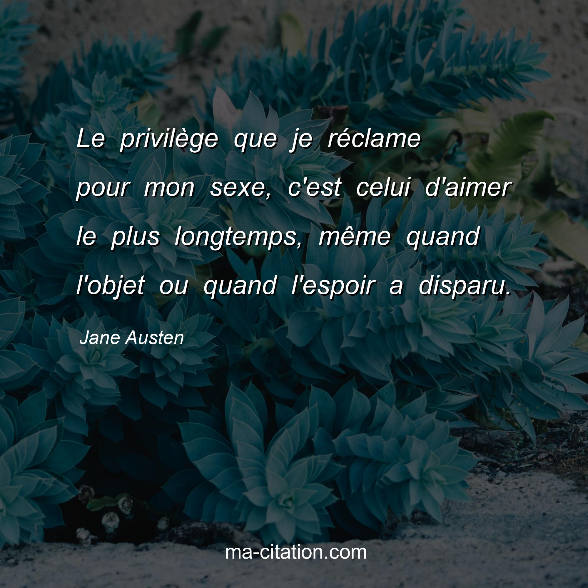 Jane Austen est l'auteur de la citation sur la vie "Le privilège que je réclame pour mon sexe, c'est celui d'aimer le plus longtemps, même quand l'objet ou quand l'espoir a disparu.".