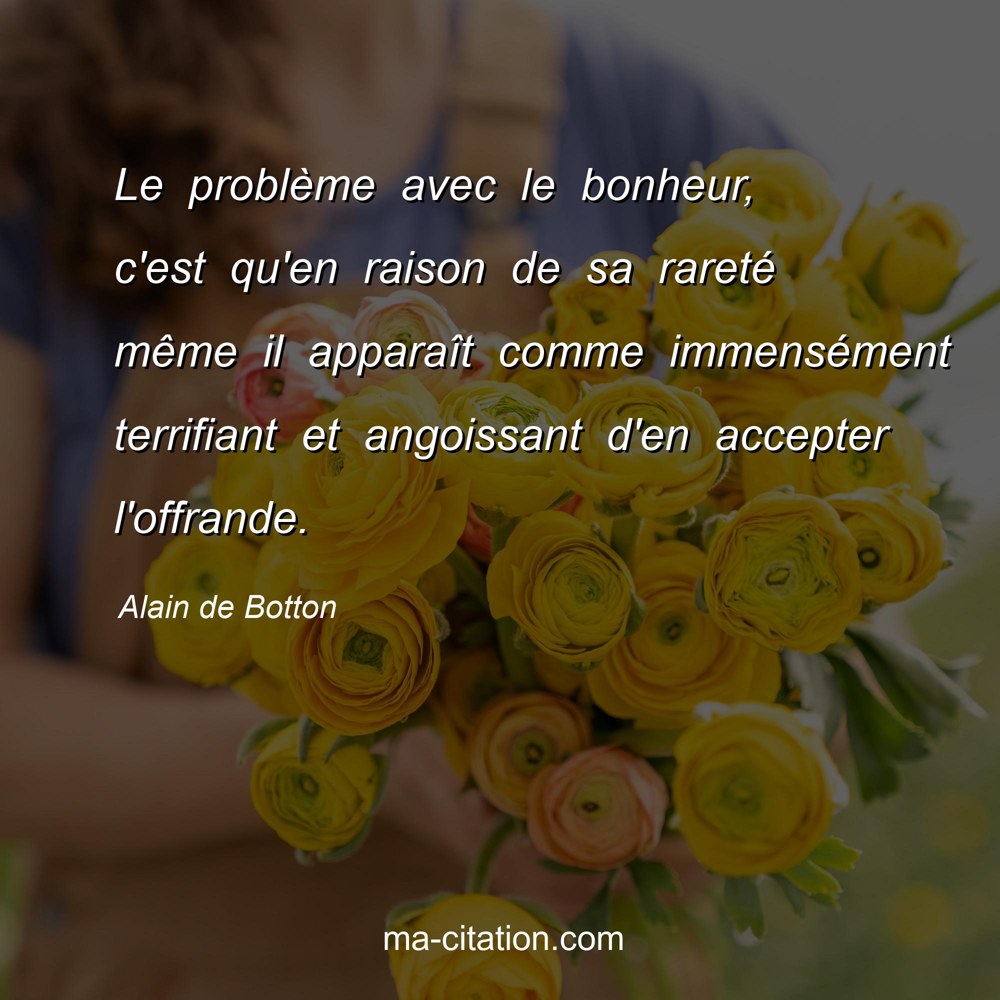 Citation sur la vie d'Alain de Botton :Le problème avec le bonheur, c'est qu'en raison de sa rareté même il apparaît comme immensément terrifiant et angoissant d'en accepter l'offrande.