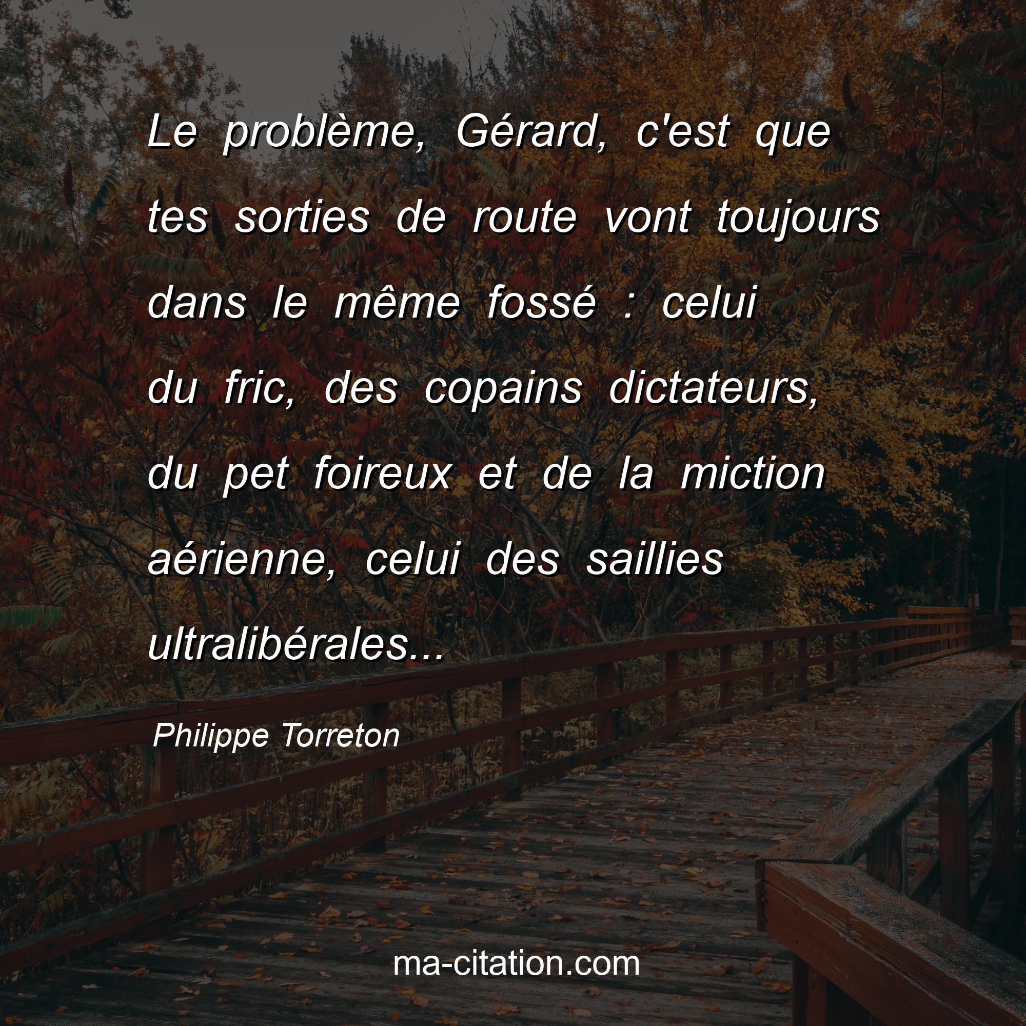 Citation sur la vie de Philippe Torreton :Le problème, Gérard, c'est que tes sorties de route vont toujours dans le même fossé : celui du fric, des copains dictateurs, du pet foireux et de la miction aérienne, celui des saillies ultralibérales...