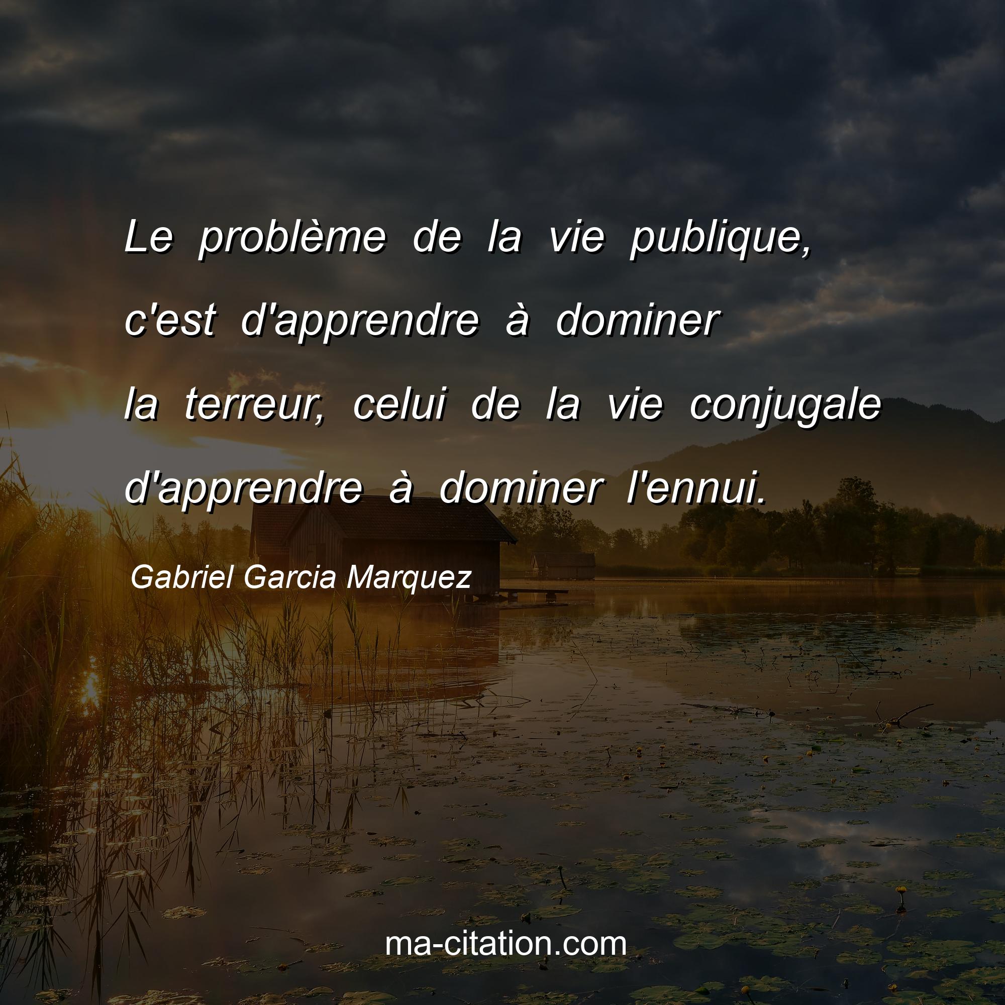 Citation sur la vie de Gabriel Garcia Marquez :Le problème de la vie publique, c'est d'apprendre à dominer la terreur, celui de la vie conjugale d'apprendre à dominer l'ennui.