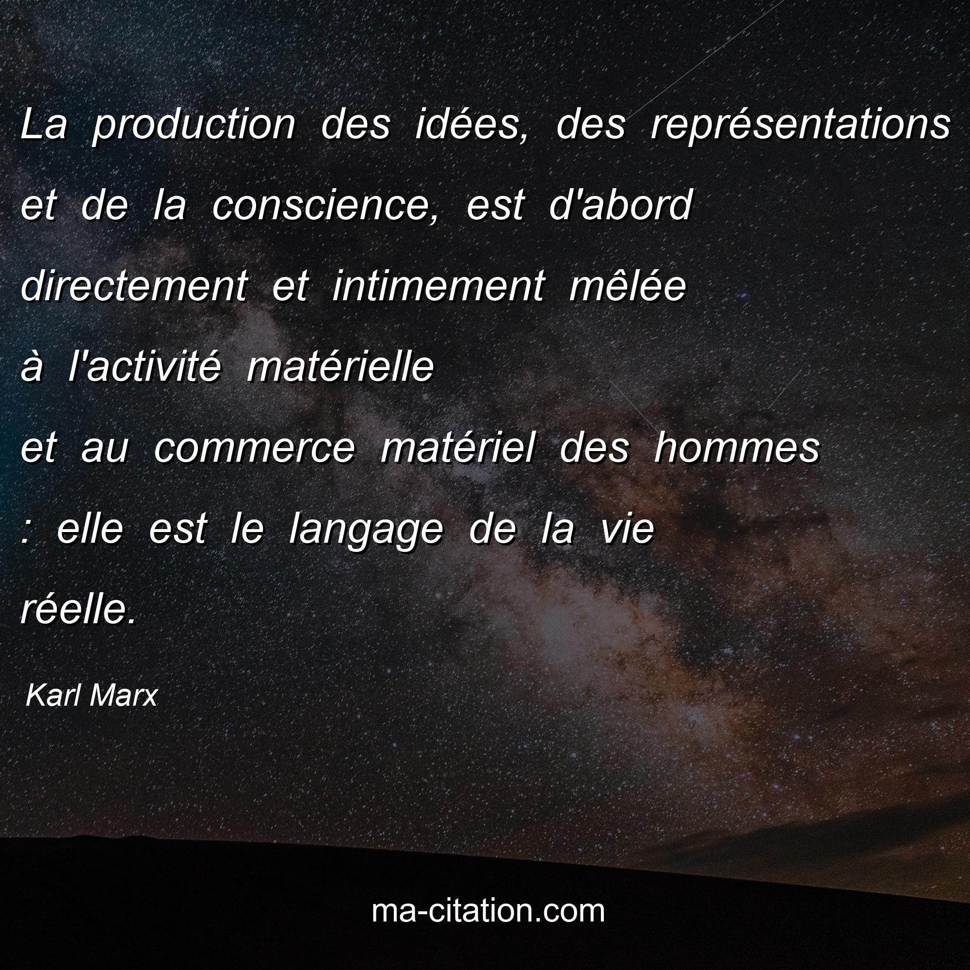 Citation sur la vie de Karl Marx :La production des idées, des représentations et de la conscience, est d'abord directement et intimement mêlée à l'activité matérielle et au commerce matériel des hommes : elle est le langage de la vie réelle.
