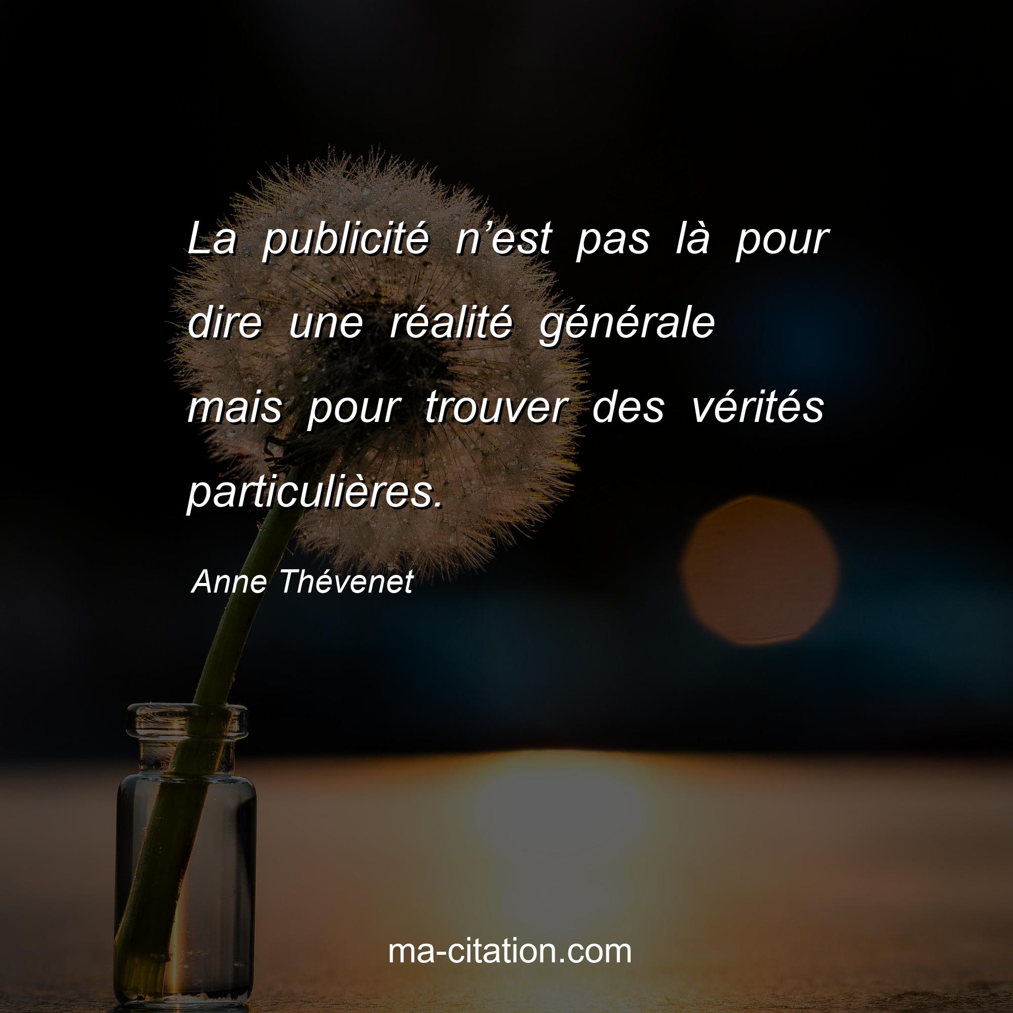 Citation sur la vie d'Anne Thévenet :La publicité n’est pas là pour dire une réalité générale mais pour trouver des vérités particulières.