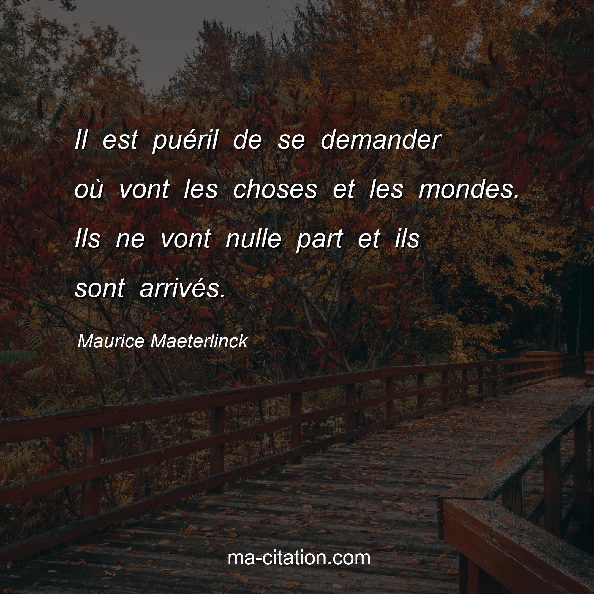 Citation sur la vie de Maurice Maeterlinck :Il est puéril de se demander où vont les choses et les mondes. Ils ne vont nulle part et ils sont arrivés.