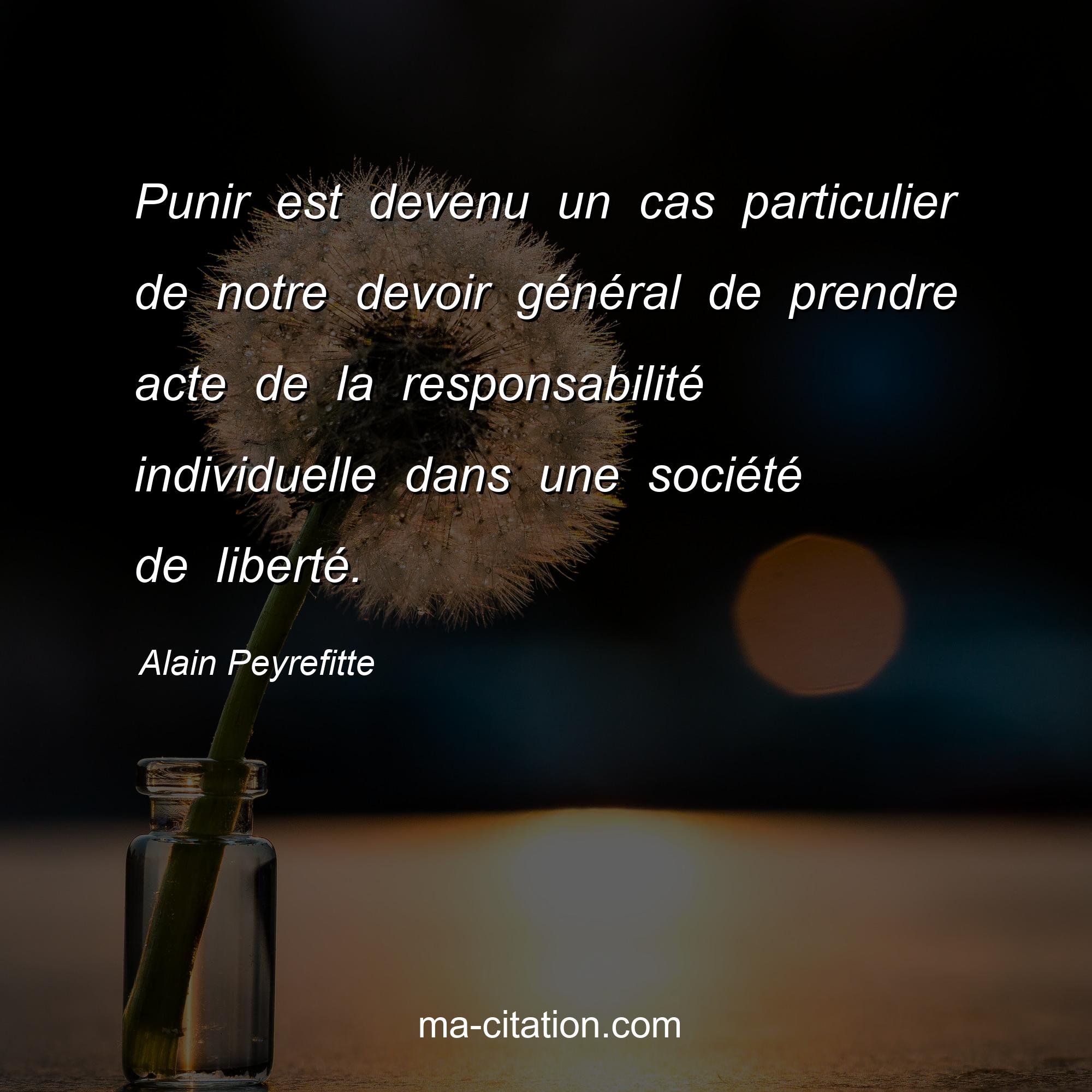 Citation sur la vie d'Alain Peyrefitte :Punir est devenu un cas particulier de notre devoir général de prendre acte de la responsabilité individuelle dans une société de liberté.