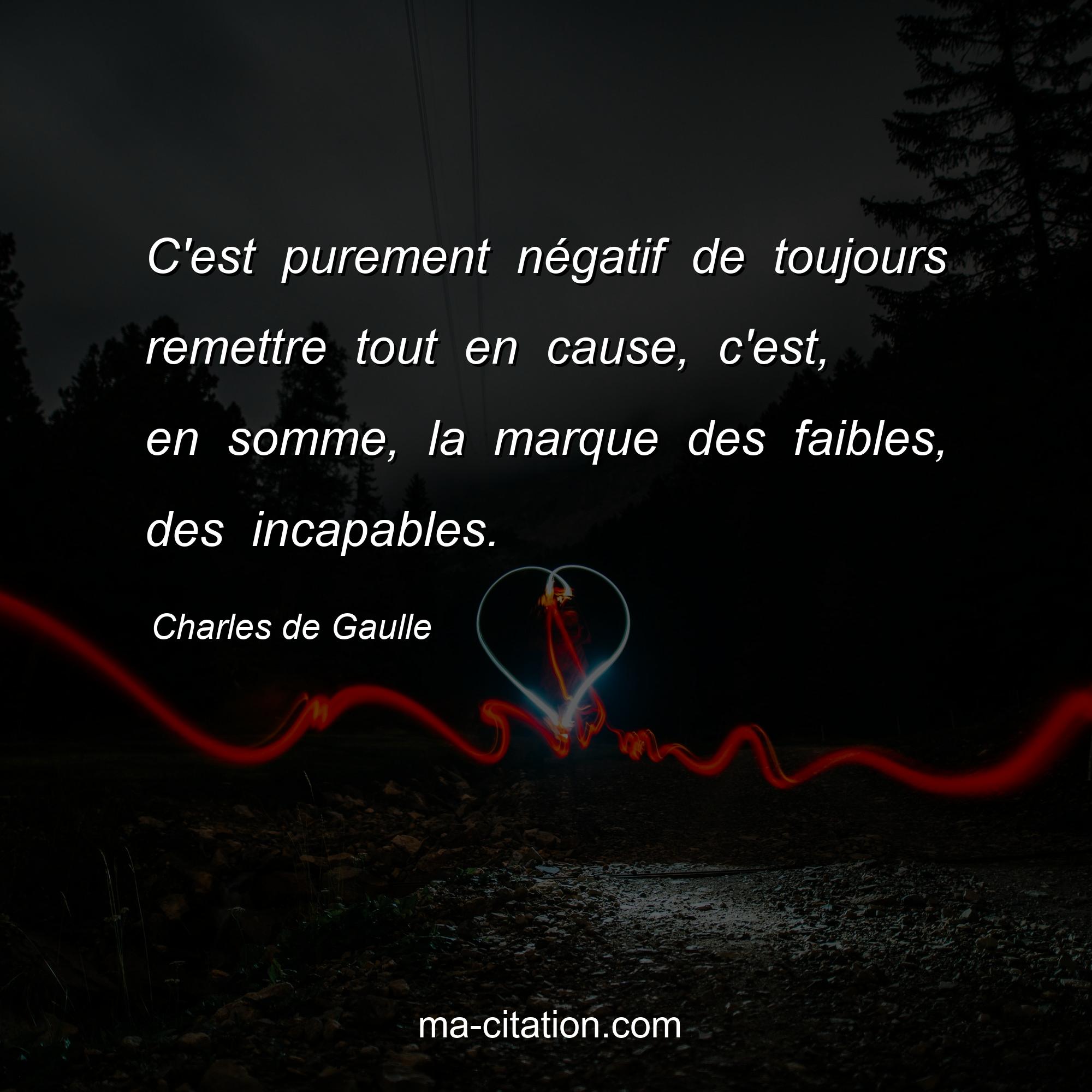 Citation sur la vie de Charles de Gaulle :C'est purement négatif de toujours remettre tout en cause, c'est, en somme, la marque des faibles, des incapables.