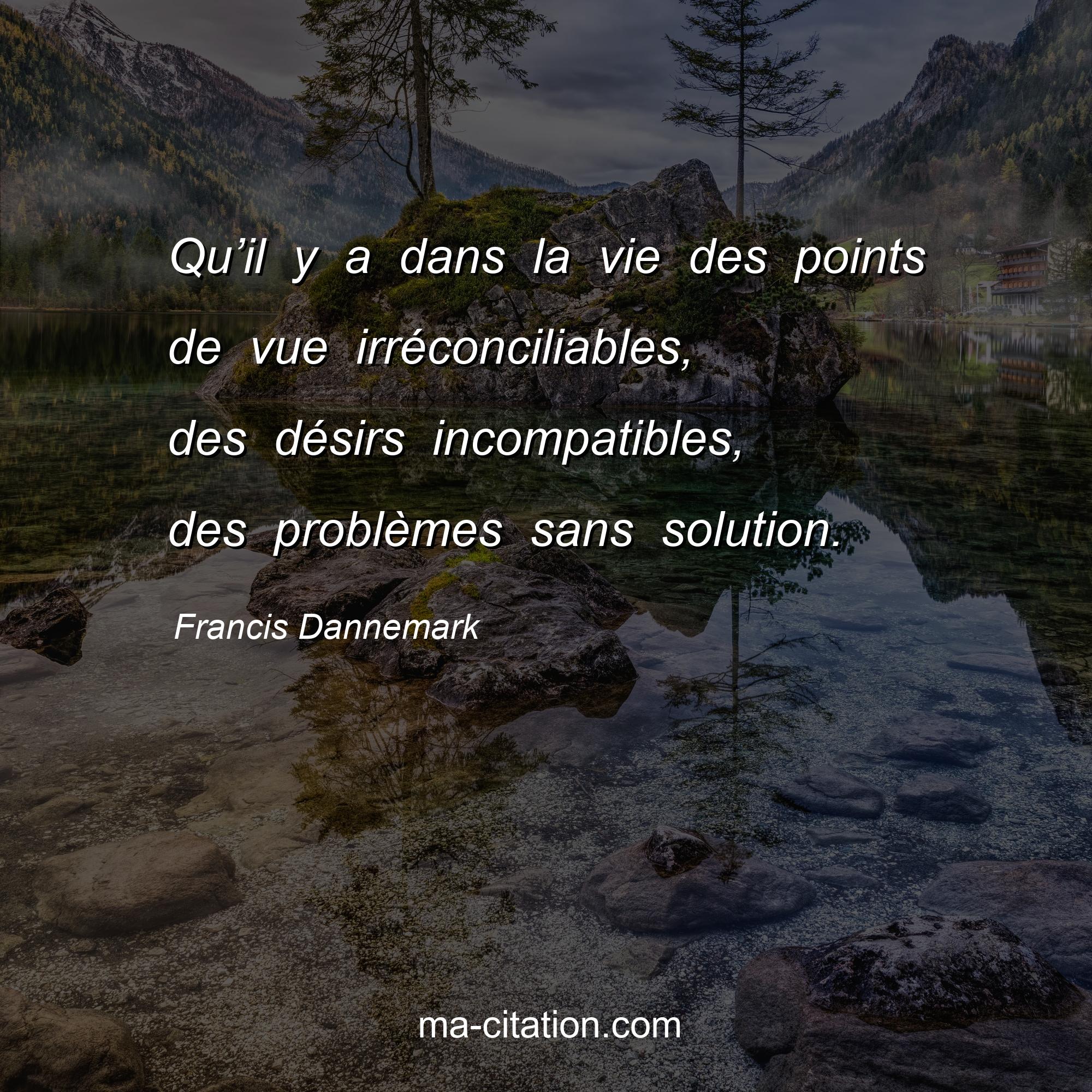 Citation sur la vie de Francis Dannemark :Qu’il y a dans la vie des points de vue irréconciliables, des désirs incompatibles, des problèmes sans solution.