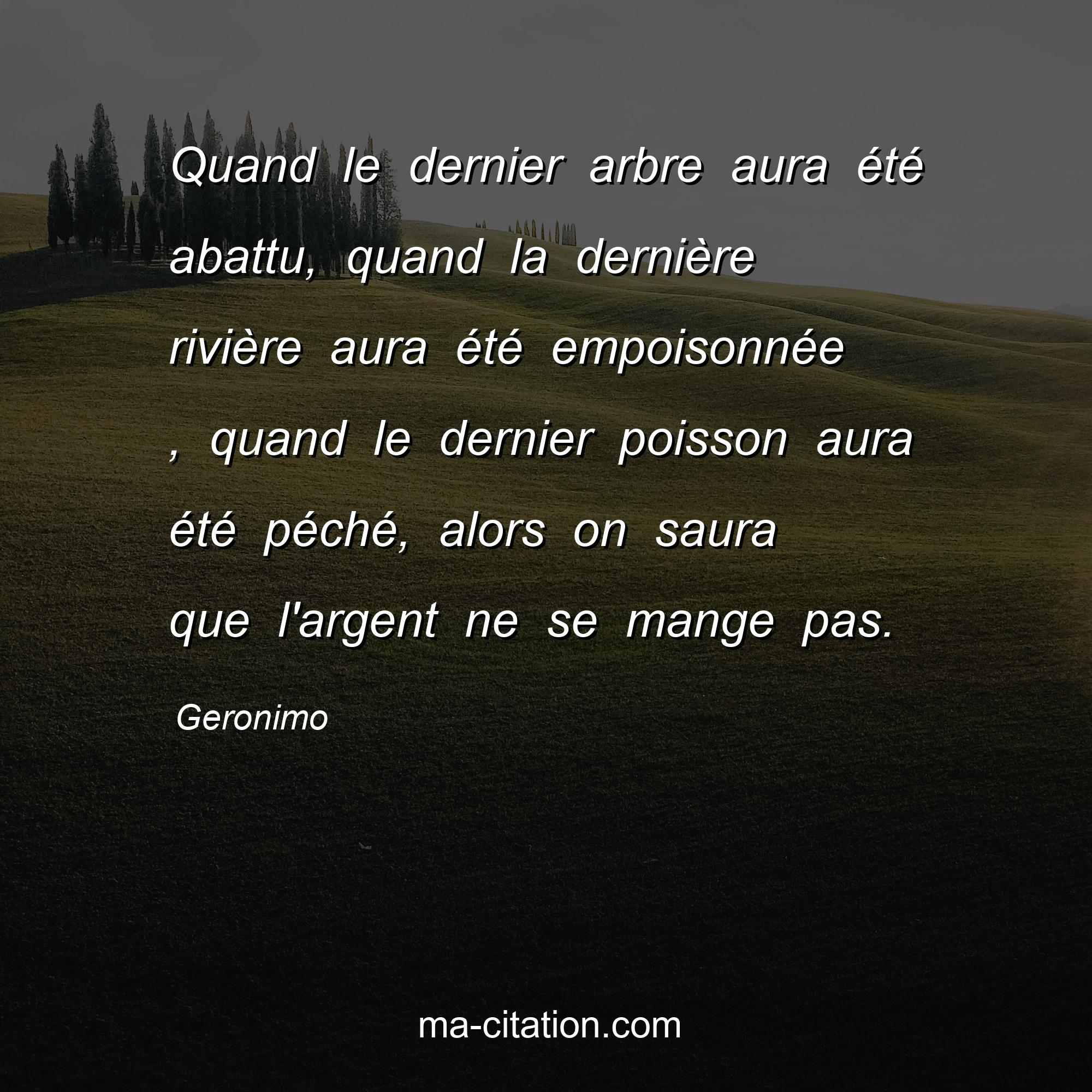Citation sur la vie de Geronimo :Quand le dernier arbre aura été abattu, quand la dernière rivière aura été empoisonnée , quand le dernier poisson aura été péché, alors on saura que l'argent ne se mange pas.