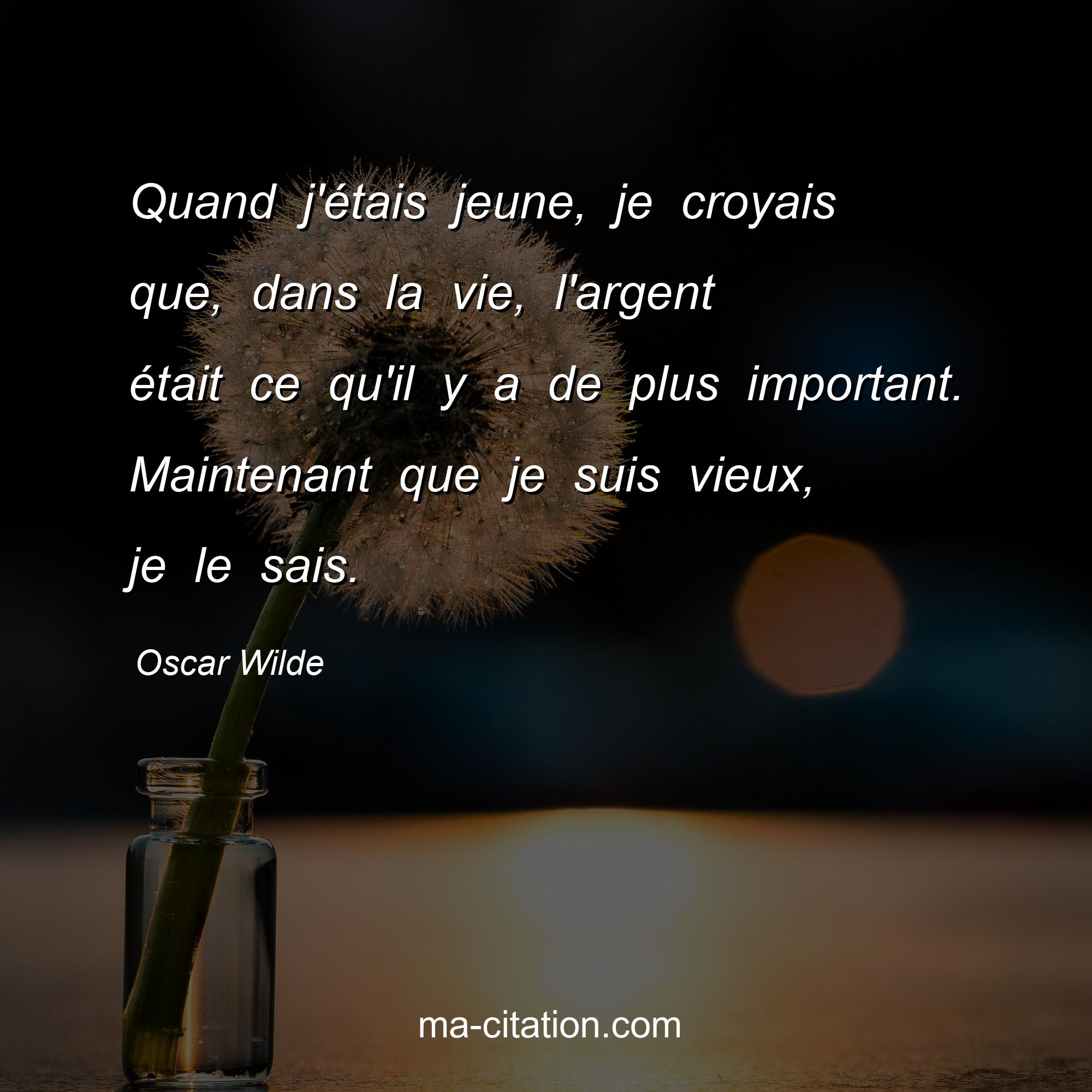 Citation sur la vie d'Oscar Wilde :Quand j'étais jeune, je croyais que, dans la vie, l'argent était ce qu'il y a de plus important. Maintenant que je suis vieux, je le sais.
