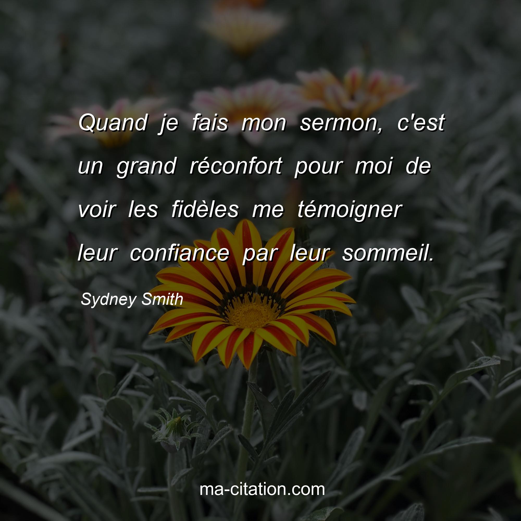 Citation sur la vie de Sydney Smith :Quand je fais mon sermon, c'est un grand réconfort pour moi de voir les fidèles me témoigner leur confiance par leur sommeil.