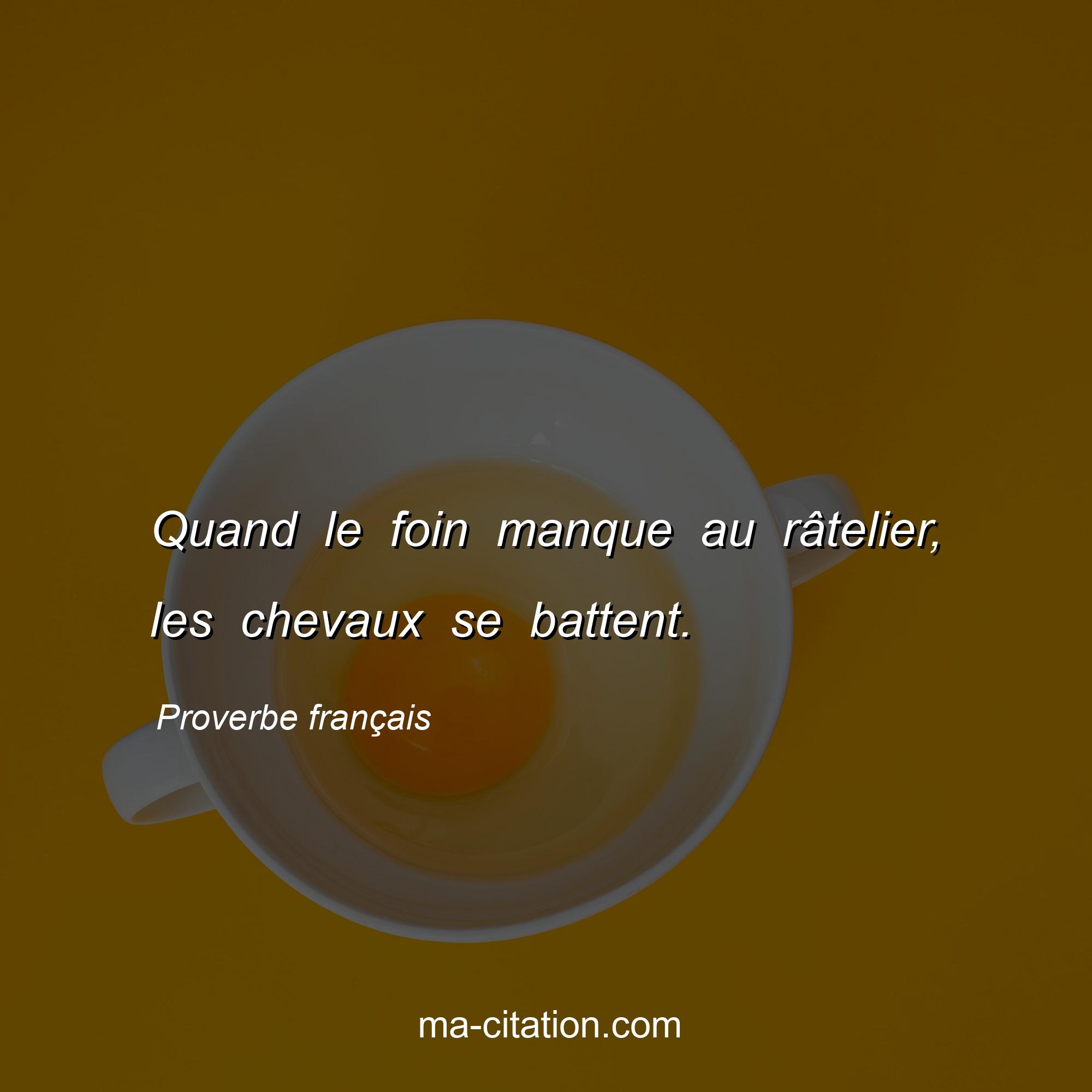 Proverbe français sur la vie :Quand le foin manque au râtelier, les chevaux se battent.