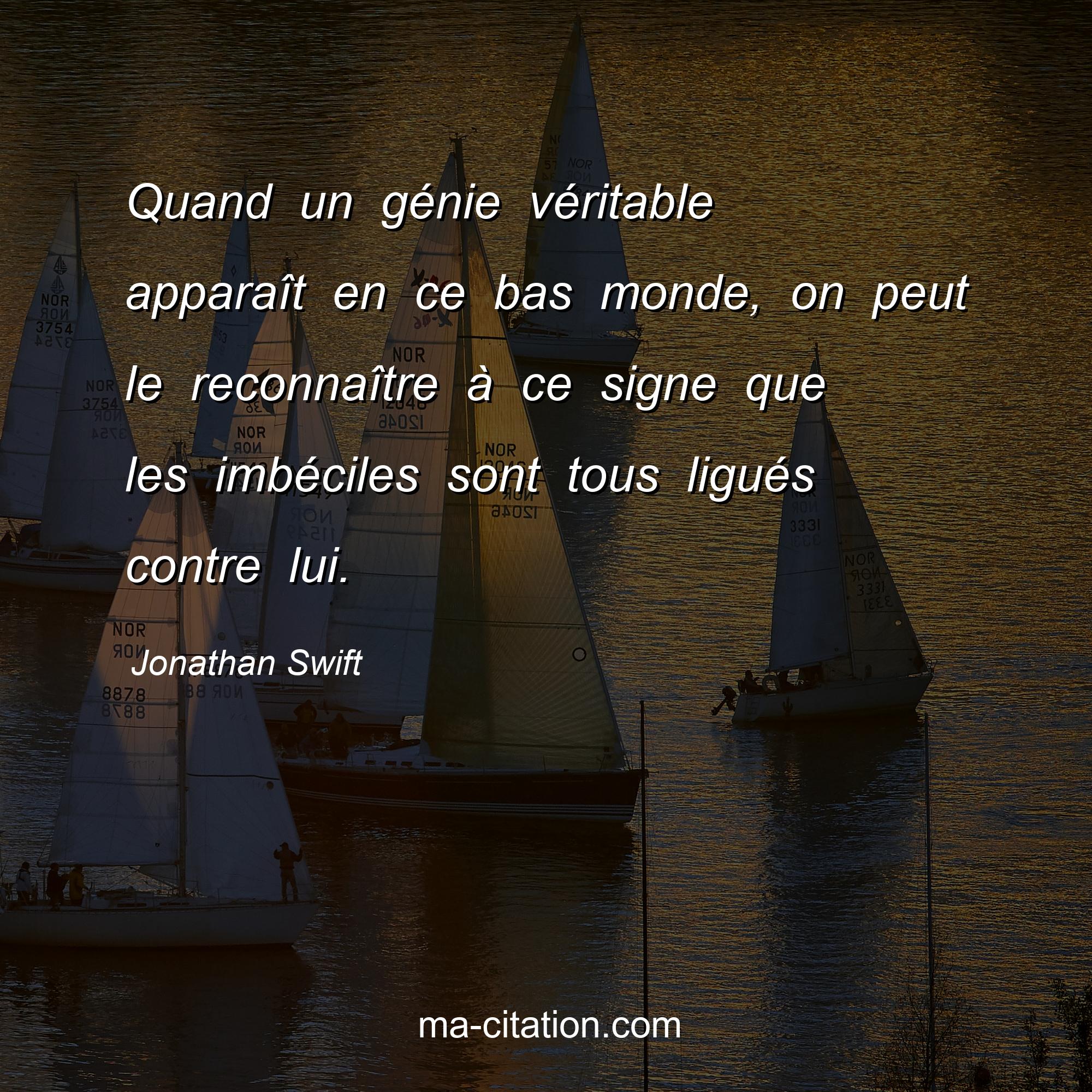Citation sur la vie de Jonathan Swift :Quand un génie véritable apparaît en ce bas monde, on peut le reconnaître à ce signe que les imbéciles sont tous ligués contre lui.