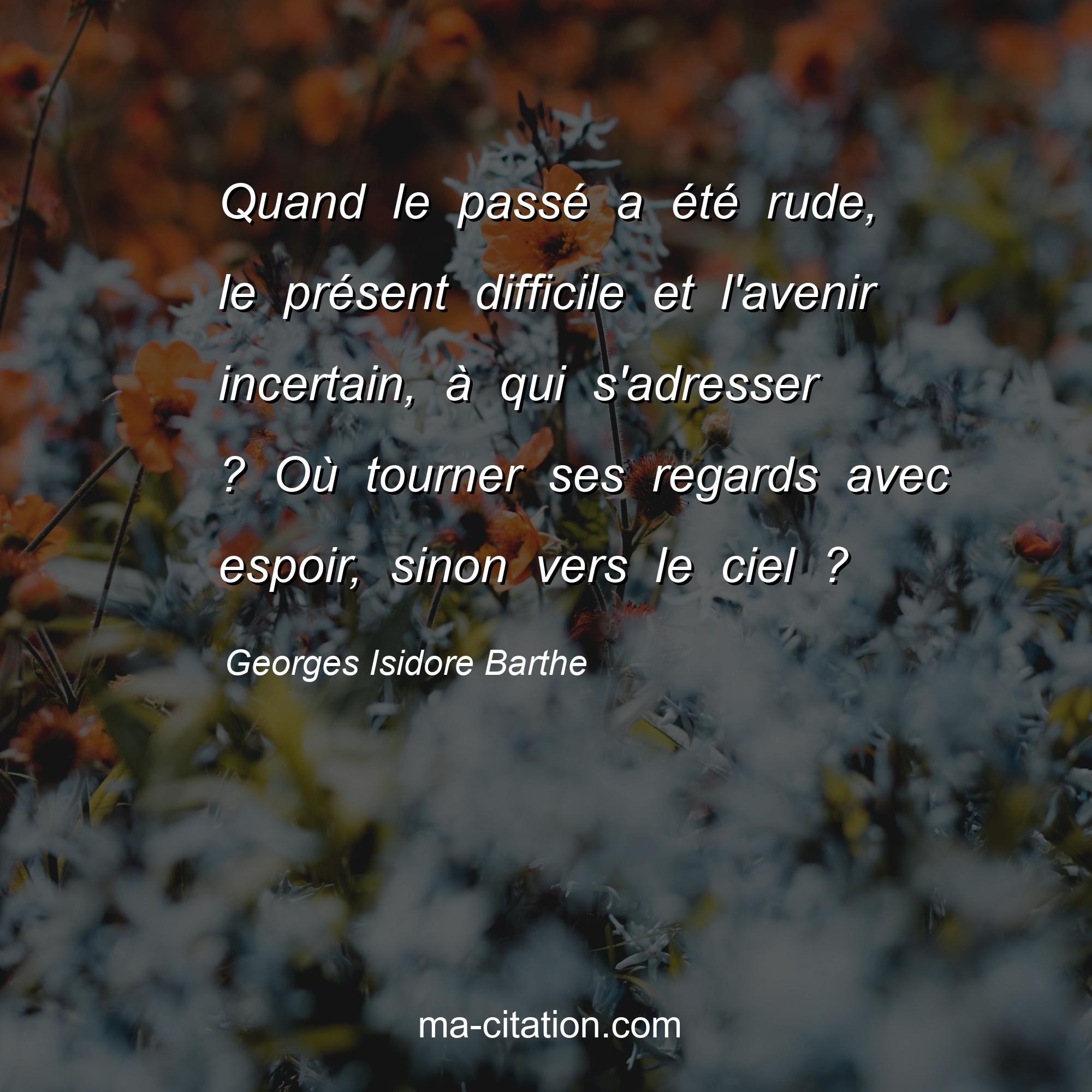 Georges Isidore Barthe est l'auteur de la citation sur la vie "Quand le passé a été rude, le présent difficile et l'avenir incertain, à qui s'adresser ? Où tourner ses regards avec espoir, sinon vers le ciel ?".