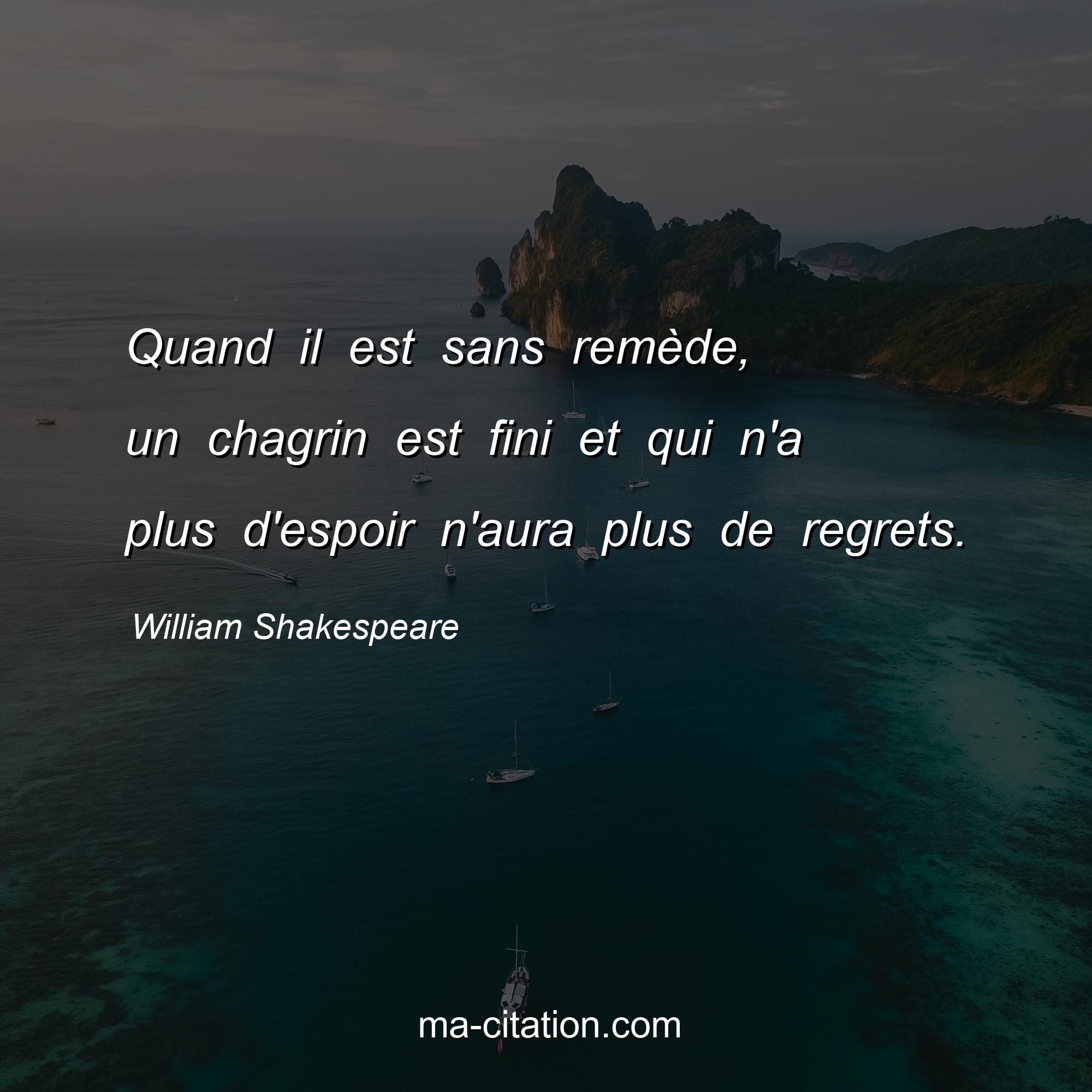 Citation sur la vie de William Shakespeare :Quand il est sans remède, un chagrin est fini et qui n'a plus d'espoir n'aura plus de regrets.