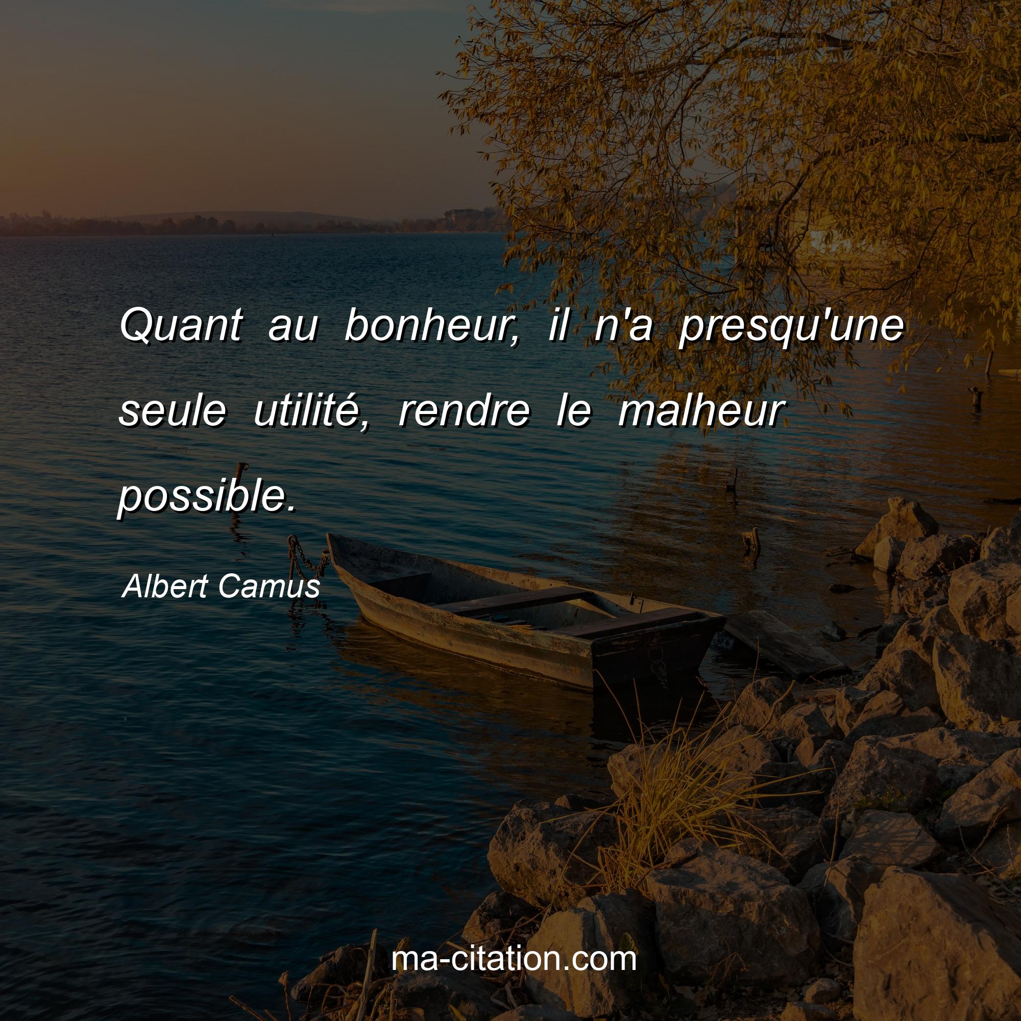 Albert Camus est l'auteur de la citation sur la vie "Quant au bonheur, il n'a presqu'une seule utilité, rendre le malheur possible.".