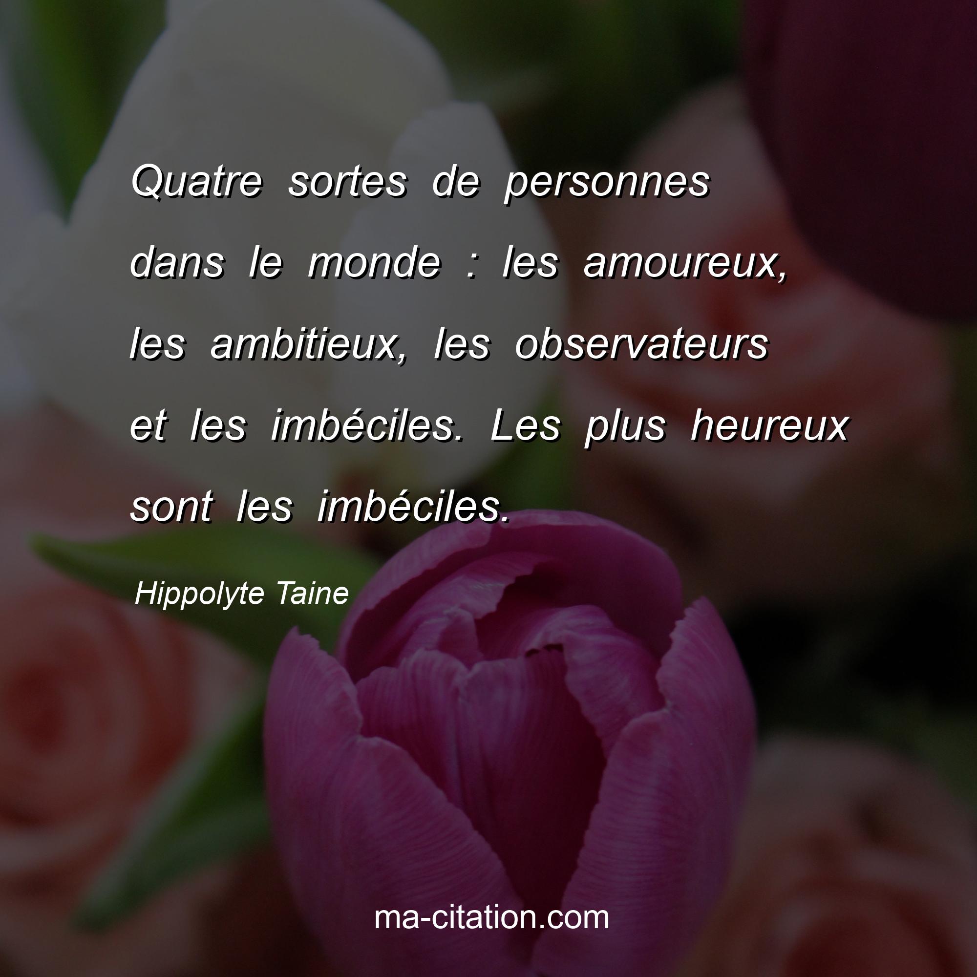 Citation sur la vie de Hippolyte Taine :Quatre sortes de personnes dans le monde : les amoureux, les ambitieux, les observateurs et les imbéciles. Les plus heureux sont les imbéciles.
