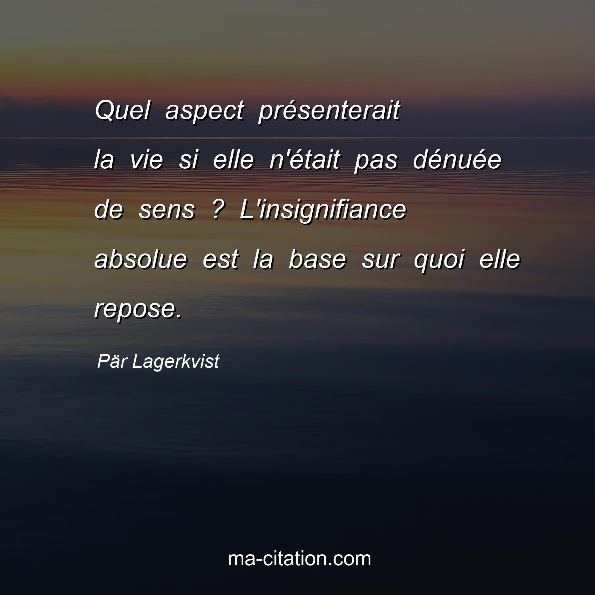 Citation sur la vie de Pär Lagerkvist :Quel aspect présenterait la vie si elle n'était pas dénuée de sens ? L'insignifiance absolue est la base sur quoi elle repose.